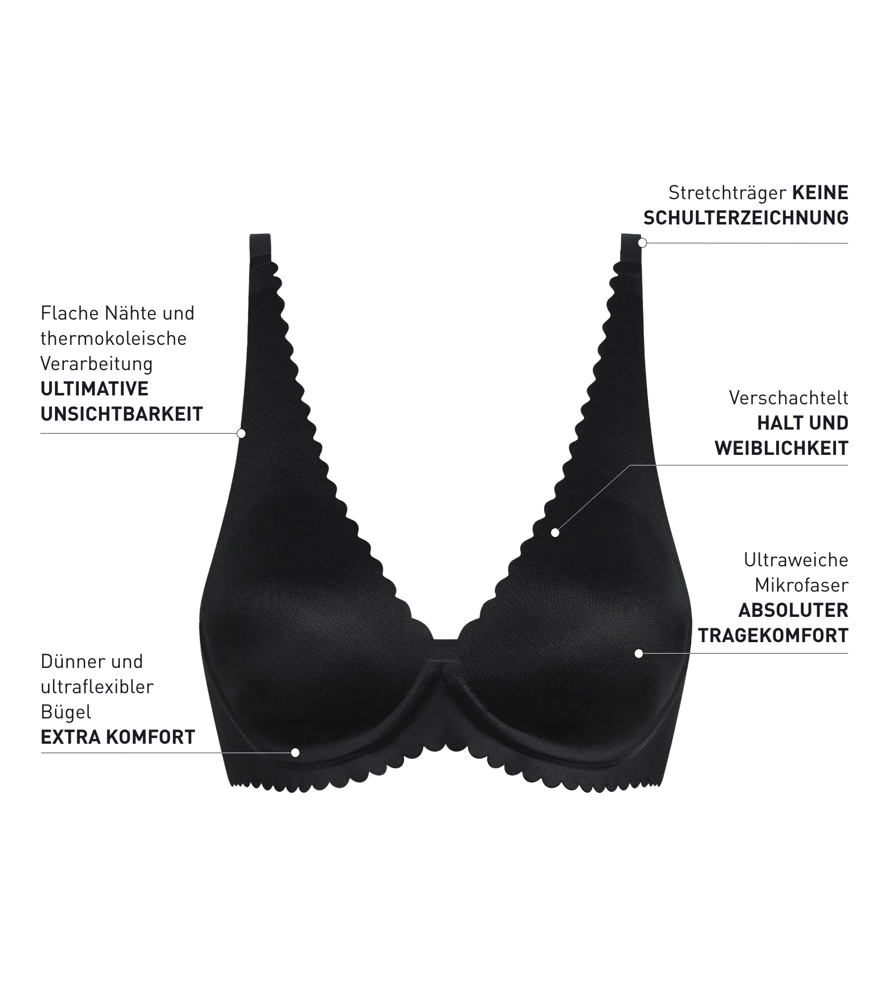 Seidig-leichte Mikrofaser schmiegt sich an wie eine zweite Haut, umhüllt und formt die Brust und sorgt für 100% Tragekomfort: Der schwarze Body Touch Bügel-BH macht seinen Job einfach richtig gut. Sein schmeichelhafter V-Ausschnitt mit weicher Wellenkante setzt Dein Dekolleté perfekt in Szene.