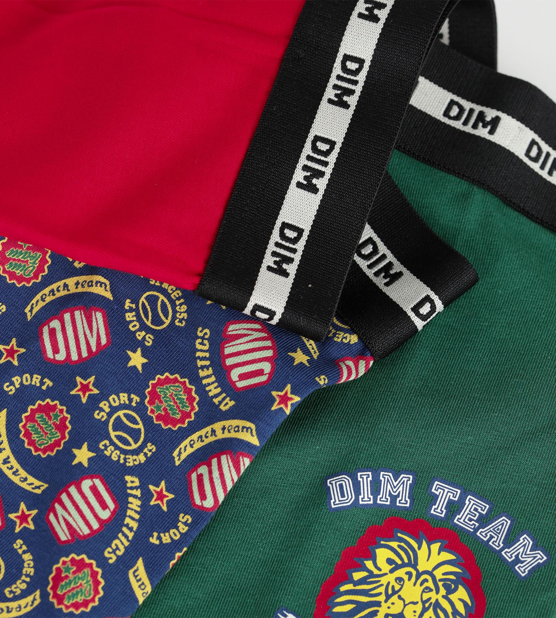 Bring Energie in seine Garderobe mit dem 3er-Pack Boxershorts für Jungen aus Stretch-Baumwolle von Dim mit sportlichen Logos in Rot, Grün und Blau.