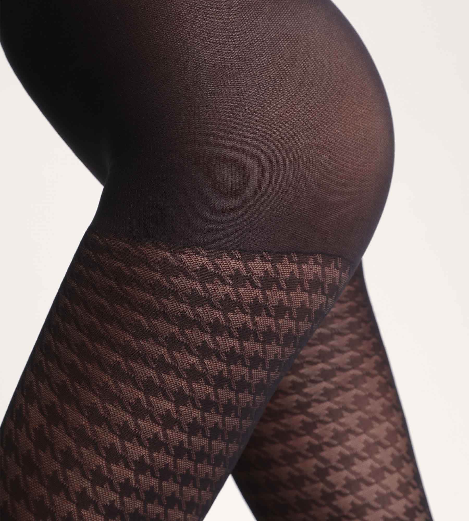 Zeige einen Couture-Look mit der semi-opaken DIM Style Damen Fantasie-Strumpfhose mit schwarzem Hahnentrittmuster.