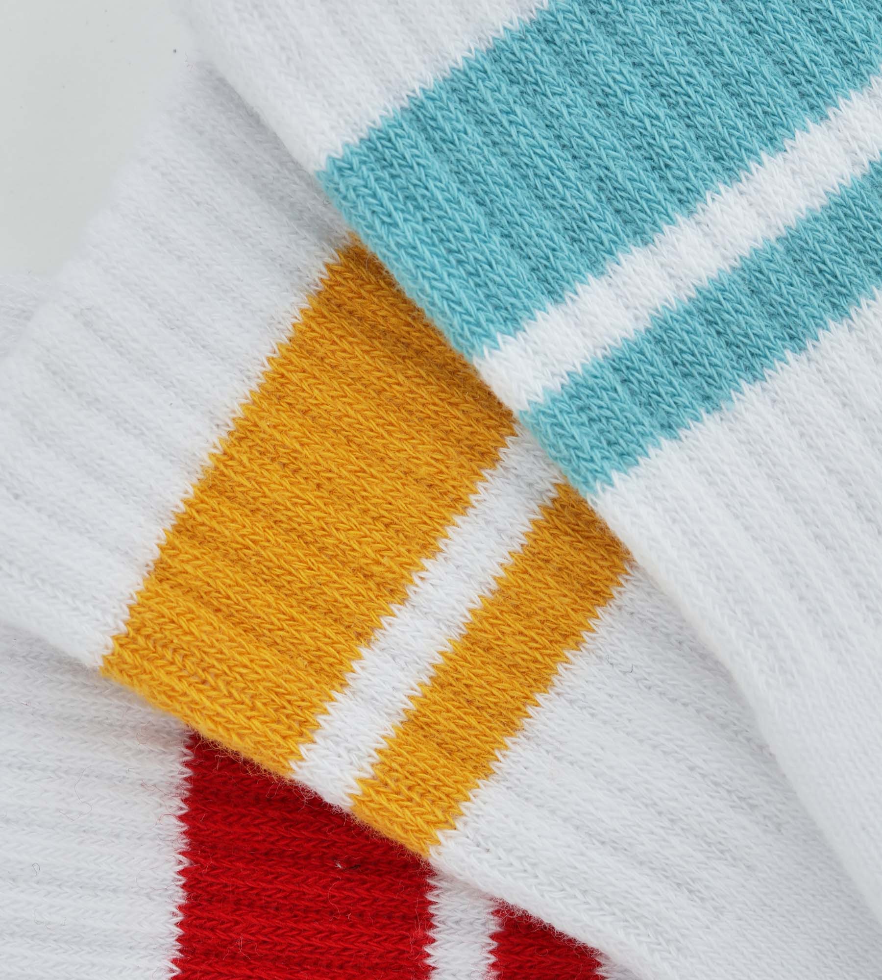 Die fröhlichen Streifen in Mohnrot, Türkis und Maisgelb bringen Farbe in die breiten, stretchigen Bündchen unserer Kindersocken. Perfekt für den Sport und für jeden Tag. Die weiche Baumwoll-Qualität ist besonders atmungsaktiv und hautfreundlich - Schwitzefüße adieu!