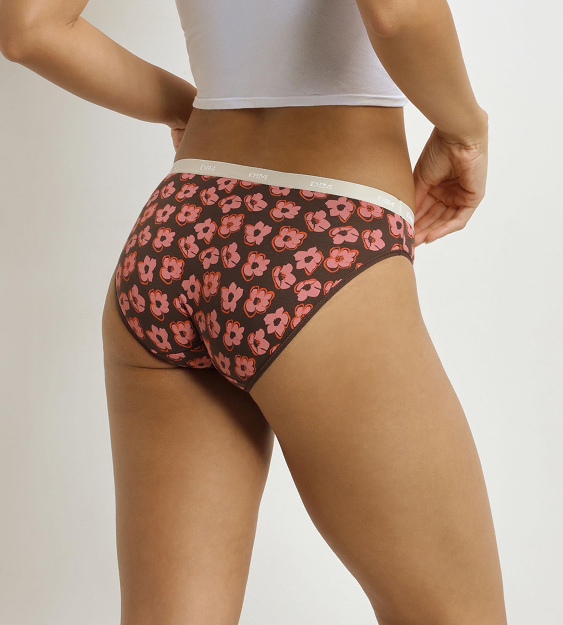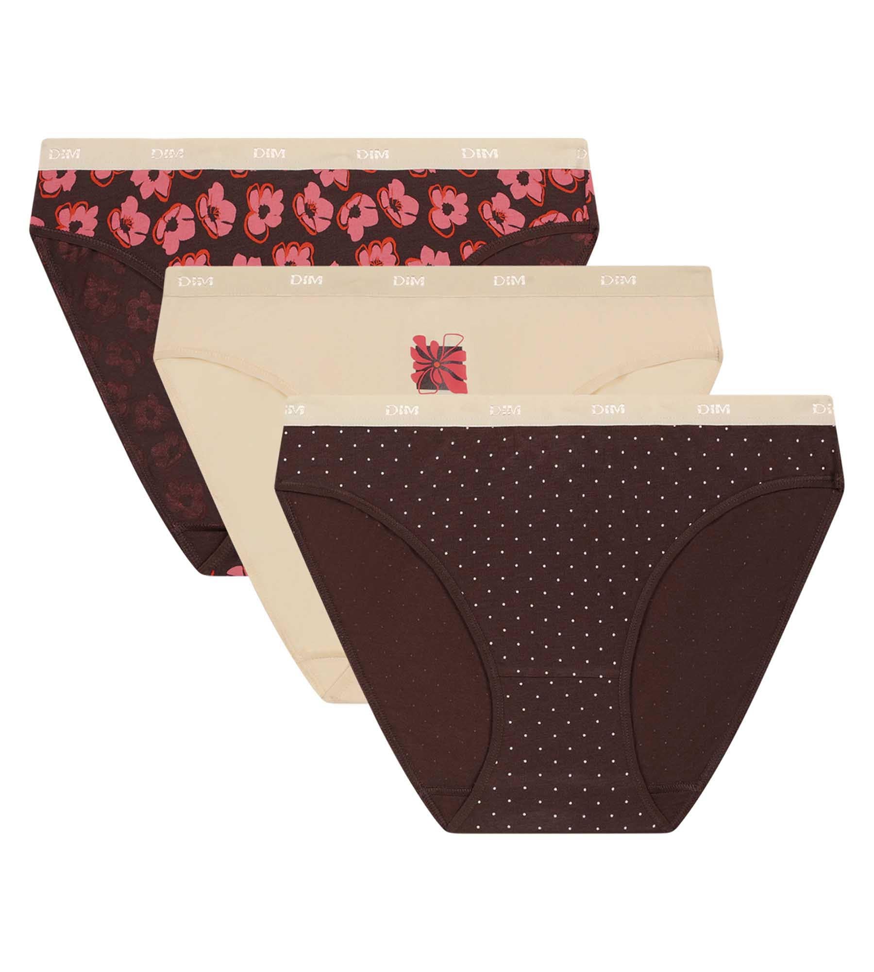 This Pack of 3 women's Dim Les Pockets briefs unites comfortable yet visually striking styles: a white chip brief on a chocolate background, a beige brief enhanced with a contrasting graphic flower, and a brown version adorned with pink flowers. Each pair of women's briefs is made from soft stretch cotton that moves with you without constraint. Flat seams and a soft, elasticated waistband ensure discreet support under your clothes.