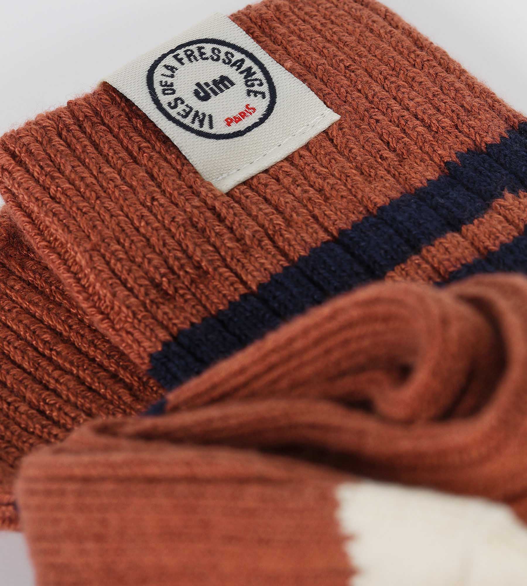 The Dim x Inès de La Fressange women's fancy socks in Redwood Brown offer a good balance between classicism and originality. Bamboo viscose brings suppleness and colour intensity, while ensuring optimal everyday comfort. With its brown colour, beige accents on the heels and toes and dark blue stripes, this pair revisits sporty style with finesse. An accessory to pair easily with light jeans, a pencil skirt or Bermuda shorts.