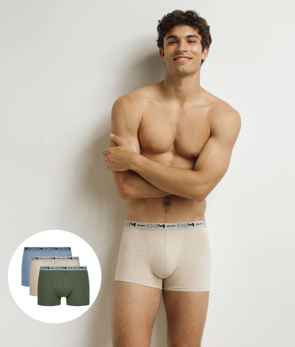 Succumb for the cocooning style of the Dim Men's Organic Stretch Cotton Greige, Blue and Khaki Boxer Pack of 3!