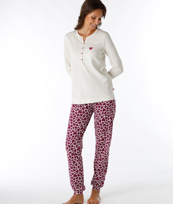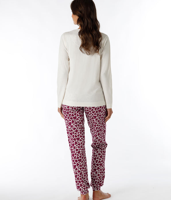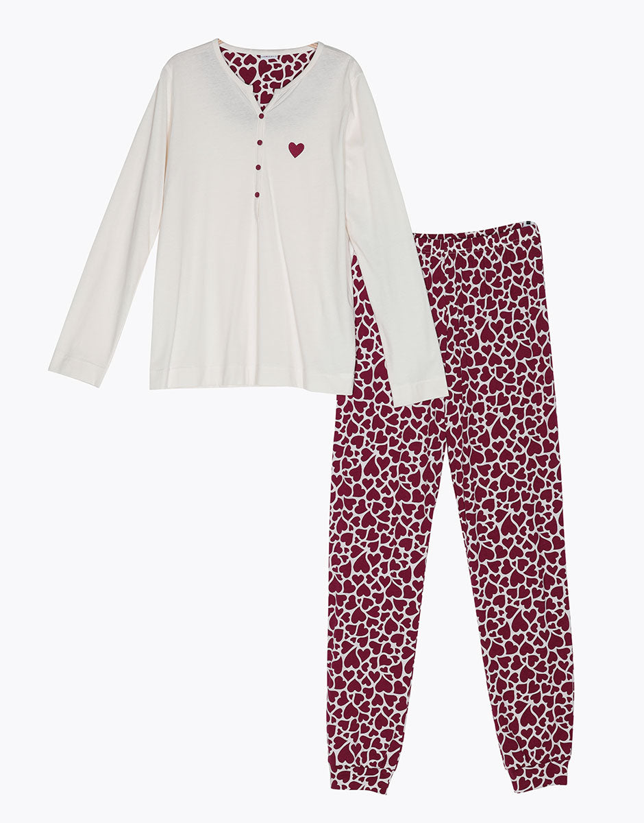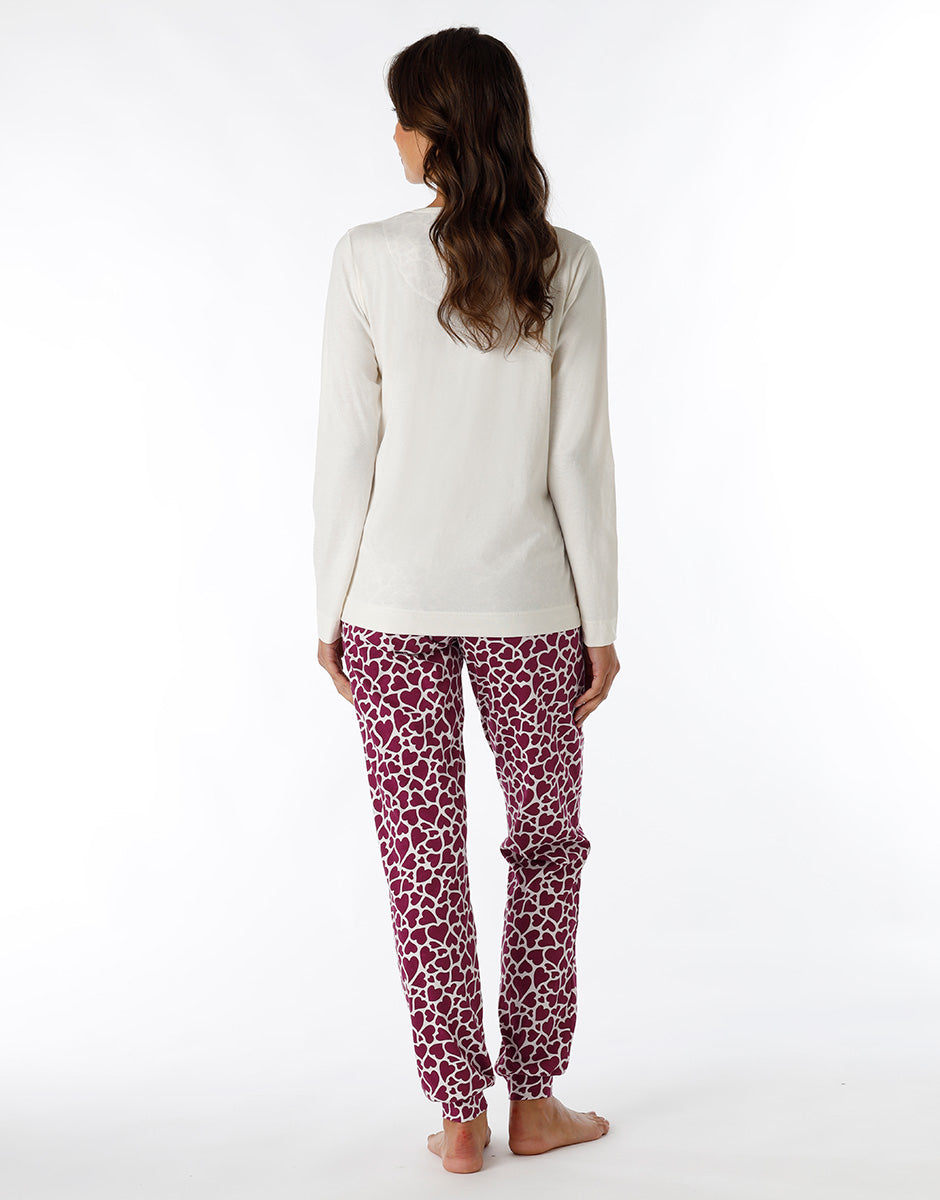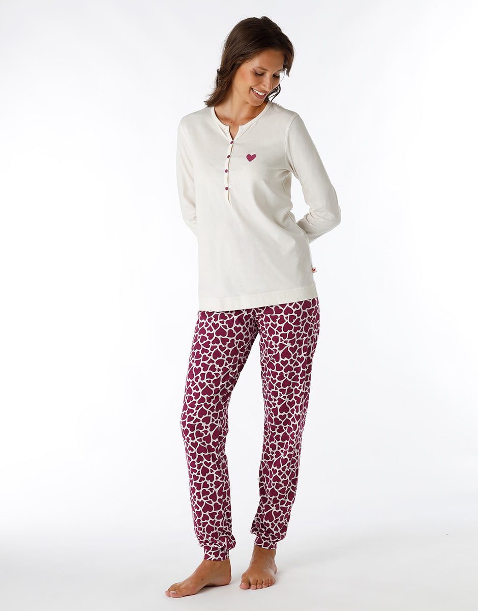 Discover the long pajama set in jersey, a perfect choice for those looking for comfort and style. The ivory shirt with a deep Serafino collar and contrasting buttons adds an elegant touch, while the printed inner lining adds a unique and feminine detail. The all-over printed pants, with cuffs at the bottom, provide a comfortable and modern fit. The embroidered heart on the front of the shirt completes the look with a romantic and delicate touch. Made of 100% cotton, this pajama set is ideal for your relaxation nights, offering incomparable softness.