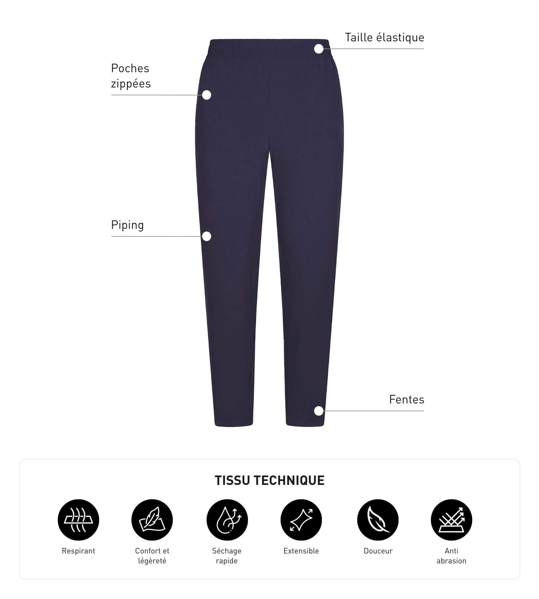 Combining style and function, these Dim Move Midnight Blue sports trousers go everywhere with you, whether in town or at the gym. With their breathable technical fabric and chino cut, the Dim Move sports trousers flatter the figure and keep you feeling fresh all the time. Contrast piping adds a modern, athletic touch, and zipped pockets keep your essentials secure.