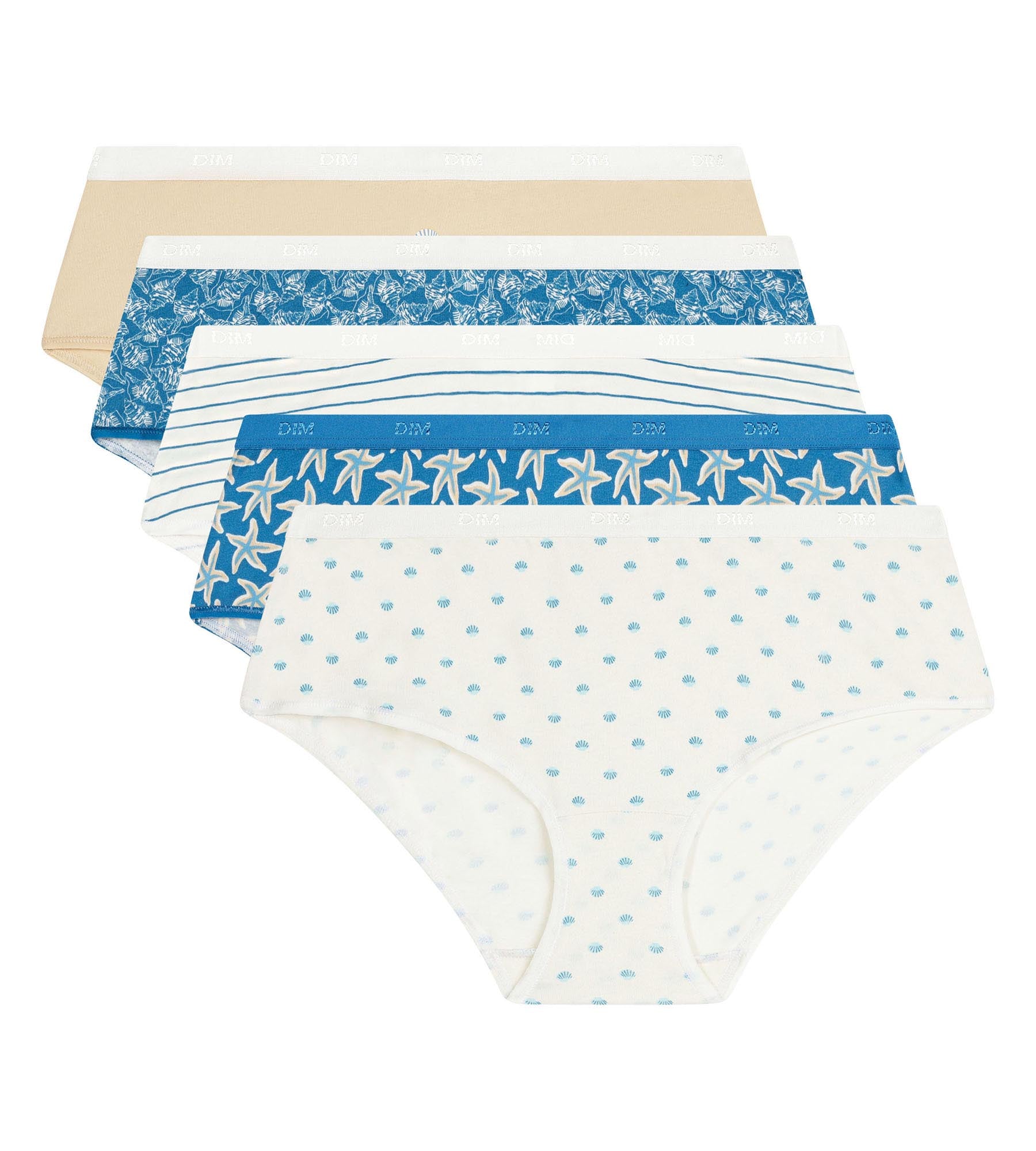 Succumb to the simple, relaxed look of the pack of 5 Les Pockets cotton boxer shorts for women, ideal for everyday wear. We love the classic yet trendy prints: a Dim women’s boxer short with sailor-style stripes, another with small shells, a blue women’s shorty decorated with stars... and plain versions for a more understated look. The stretch cotton offers unrivalled comfort, perfect under any outfit and in any season.