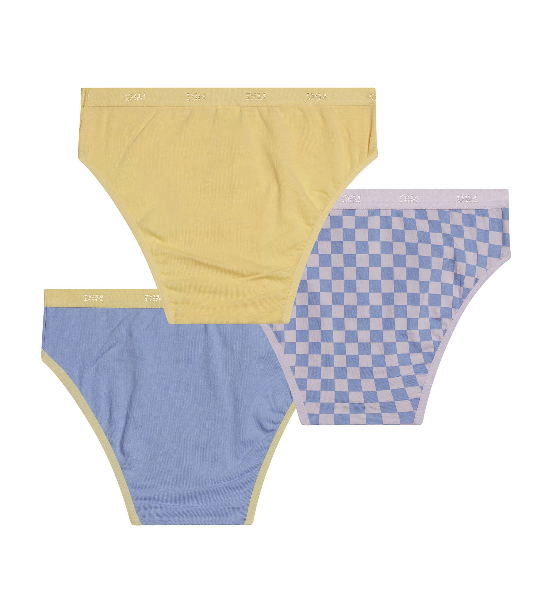 Wake up her underwear collection with the Les Pockets Pack of 3 girls' panties in yellow, purple stretch cotton with checkerboard pattern!