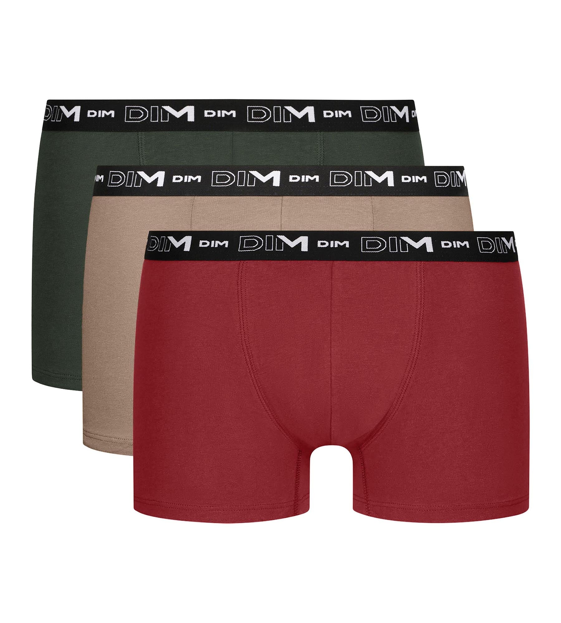 Spice up your everyday life with the Dim Men's Cotton Stretch Boxer 3-pack in Fir Green, Beige and Bright Red!