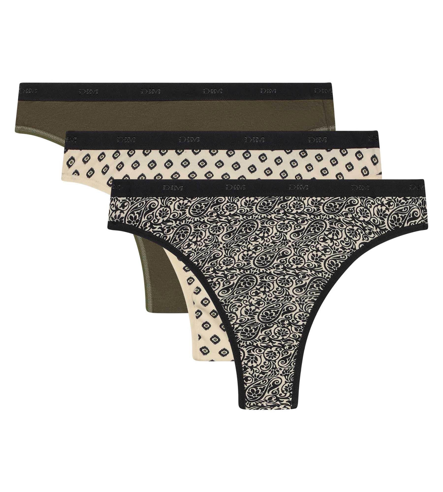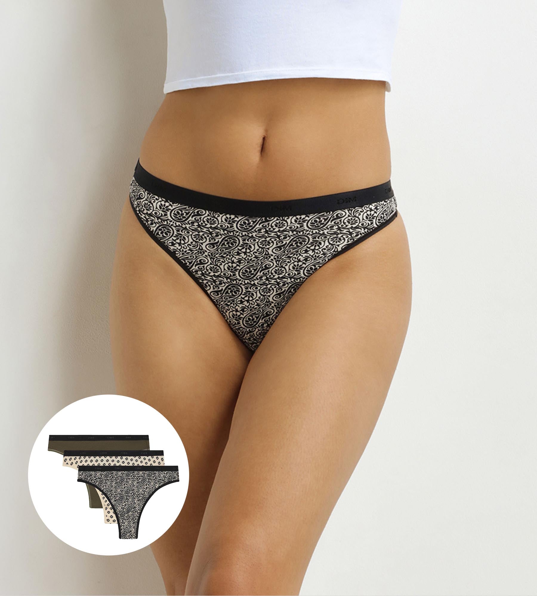 This pack of 3 women's thongs from the Dim Les Pockets range is perfect for renewing your basics in style. Between the black paisley print, the beige thong with a black geometric pattern and the plain khaki pattern, each piece brings its own dose of character. Thanks to their invisible cut and stretchy cotton fabric, these thongs for women slip easily under all your stockings, with ease.