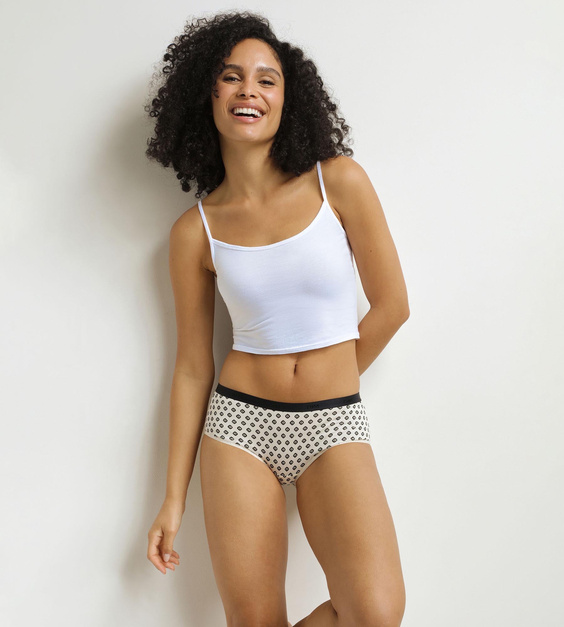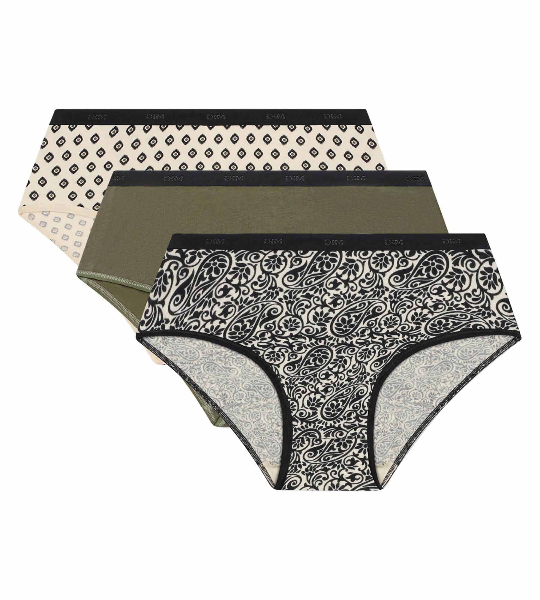 Inspired by the ethnic wardrobe, these Dim Les Pockets cotton women's boxers mix comfort with stylish patterns. Consisting of a women’s boxer brief with black paisley print, a women’s shorty with a beige diamond pattern and a plain khaki boxer brief, this Pack of 3 Les Pockets women’s cotton boxer shorts revisits cultural codes with panache! Constructed from stretch cotton, with élastic seams and a covering shape, the Les Pockets women’s boxers push your shape with ease, for everyday wear.