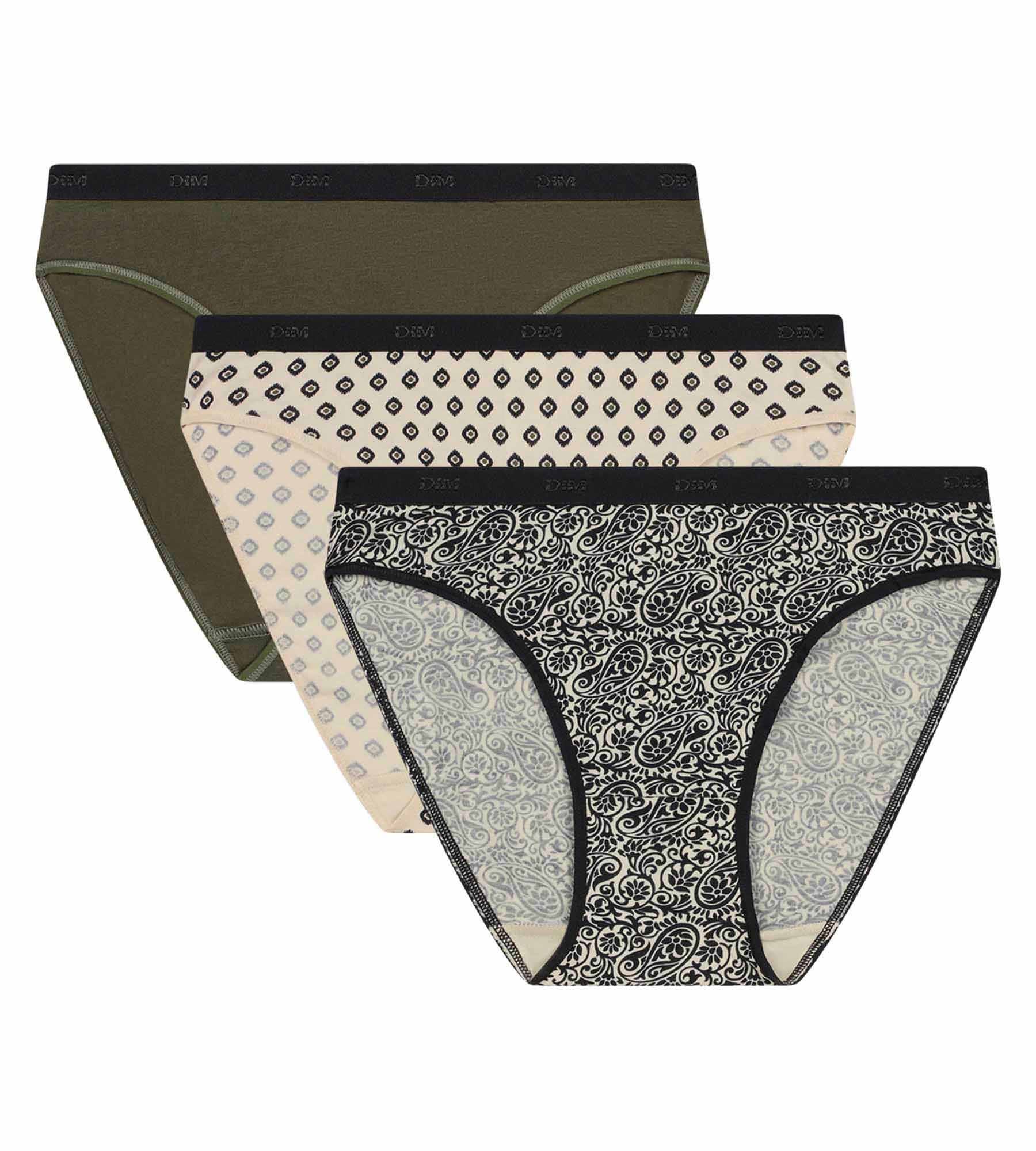 This Pack of Dim Les Pockets cotton women's knickers focuses on originality with three ethnic-inspired designs: a plain khaki brief, a small black diamond print and a stylish cashmere print on a beige background. The minimalist shape of each pair of women's knickers, the Dim logo flat waistband and the soft seams make them fun and practical basics to wear every day.