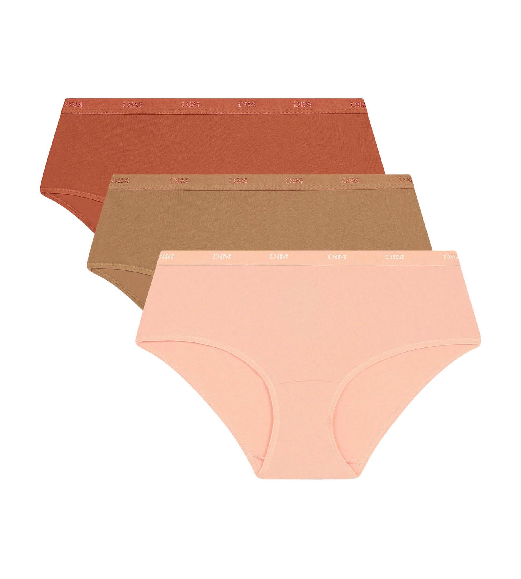 Opt for a natural, modern look with the Les Pockets EcoDim Pack of 3 women's stretch cotton shorties in shades of Speculos, Terracotta and Orange Pastel.