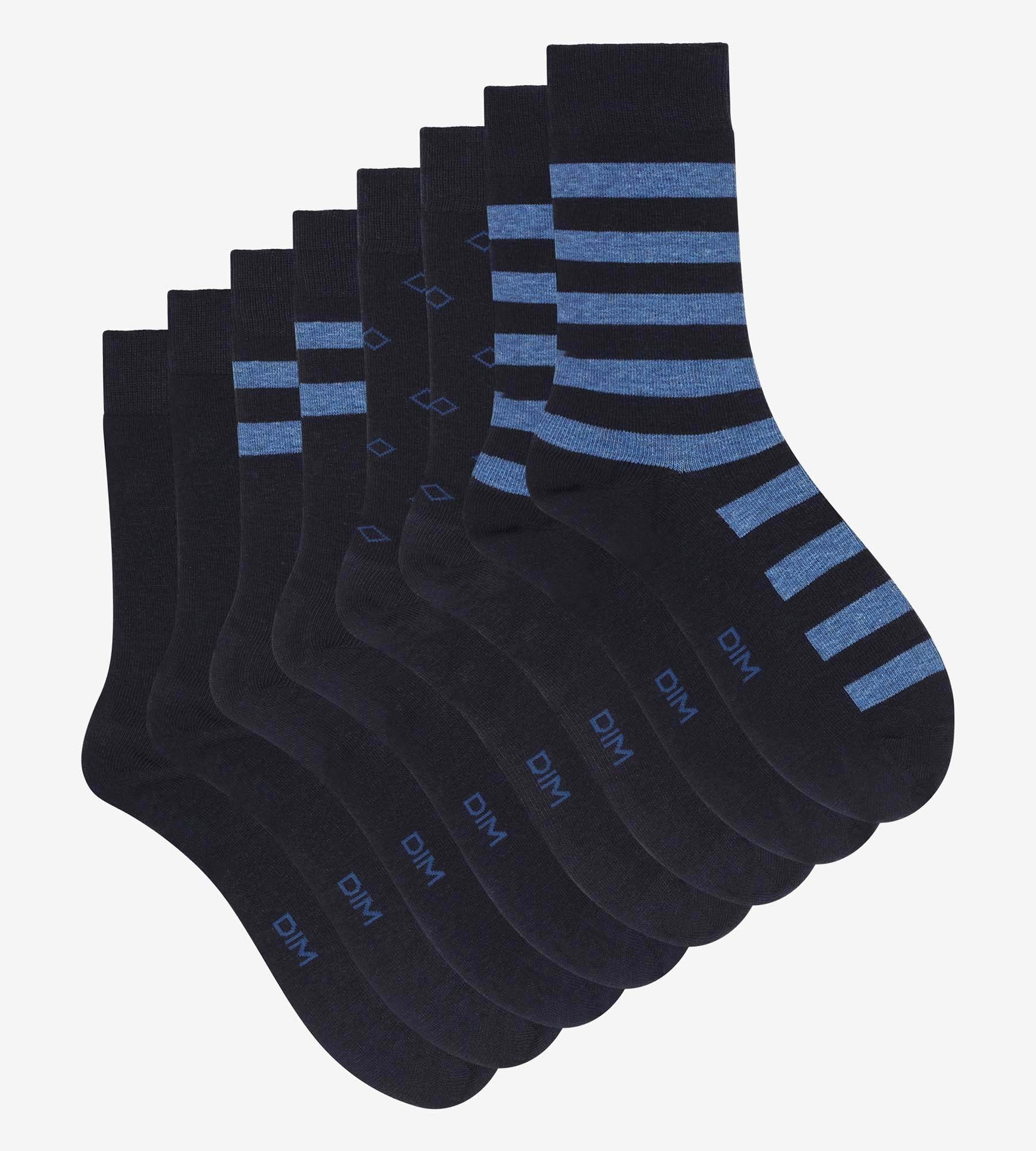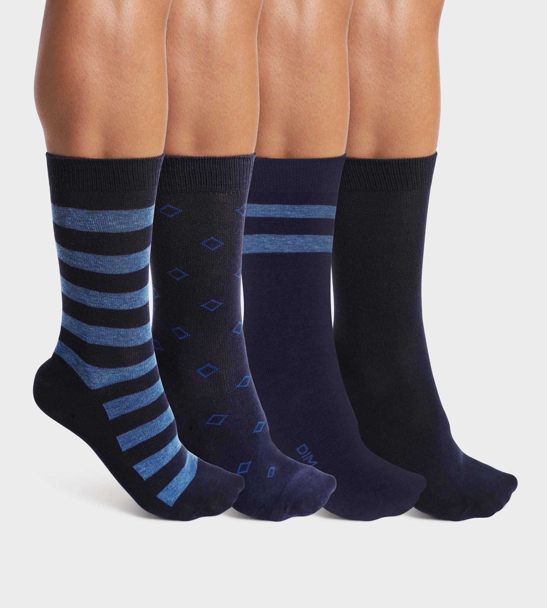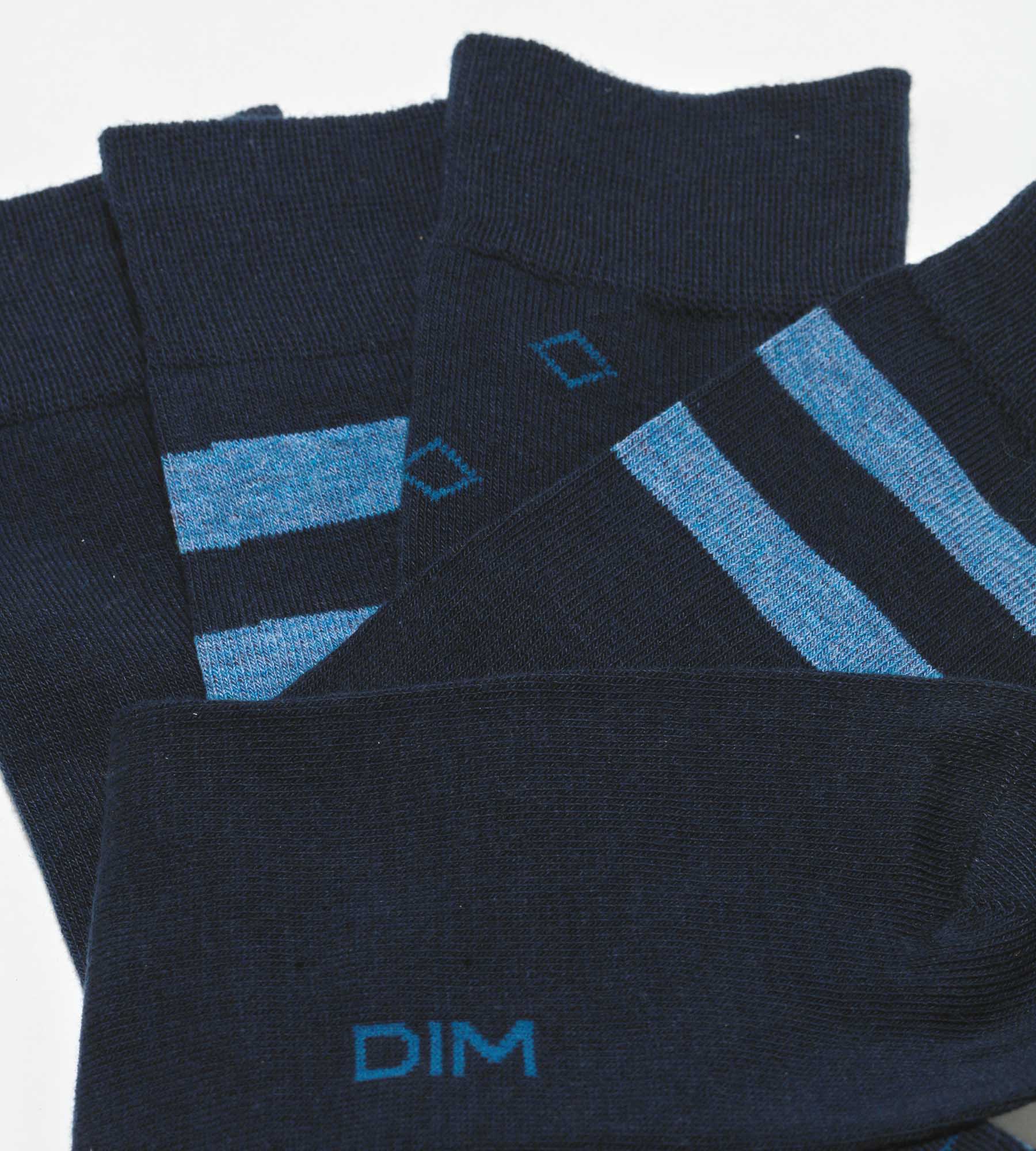 Made up of 2 pairs of striped socks, one pair of plain men's socks and a pair punctuated with diamonds, the pack of 4 EcoDim men's cotton socks allows you to vary the styles with style! Thanks to its polyester/cotton/elastane composition and its elastic finishes, your Navy men's fancy socks dry quickly and are very comfortable!