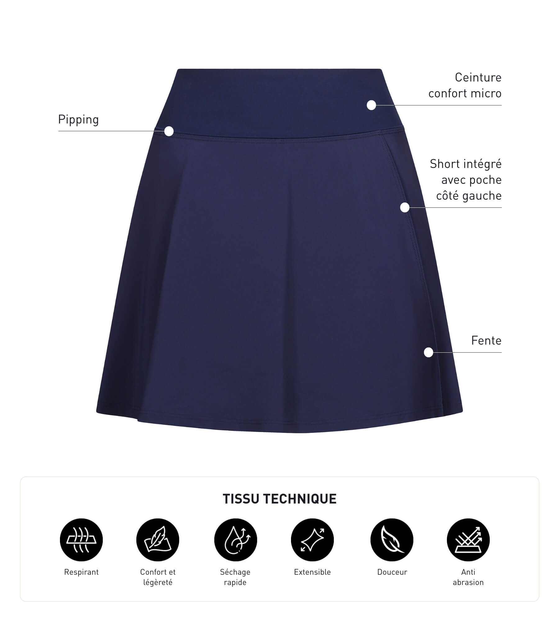 Thoughtfully designed for activities that demand agility and comfort, this Dim Move sports skirt combines style and function. The integrated microfibre shorts let you move without constraint, even when you're doing loose or dynamic movements. We love their fluid cut, which adapts to the body without sticking, and their Midnight Blue colour, which gives you an athletic look. Whether for a dance class, or a running outing, this versatile short skirt becomes an essential ally.