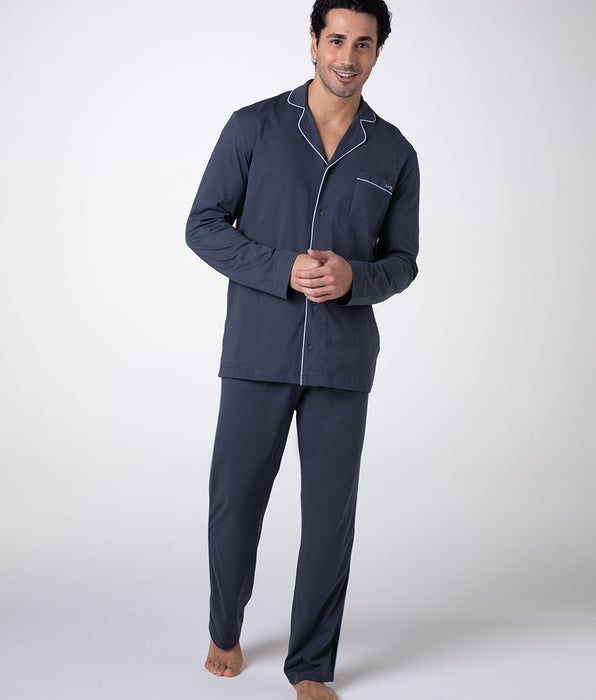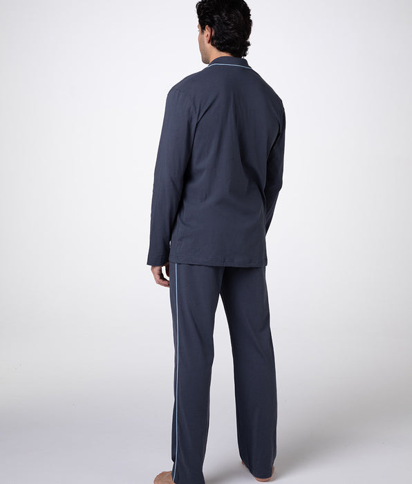 Discover the sophisticated comfort of our long open pajama set in slate cotton jersey. The jacket, with an opening and a chest pocket at the front, offers an elegant and practical look, perfect for relaxation. The pants, with a drawstring waist and side pockets, guarantee a comfortable and functional fit. The contrasting piped trim, applied to the edges of the jacket and the side of the pants, adds a distinctive and modern style. Made from soft jersey, this pajama set offers maximum comfort without sacrificing elegance.