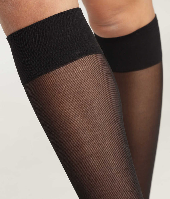 Practical and sophisticated, Dim Style women's knee-highs in sheer black voile slip discreetly and comfortably under 7/8ths pants and long dresses. Thanks to the contrasting piping at the back of the calf, Dim Style black knee-highs add a polished visual touch to your look.