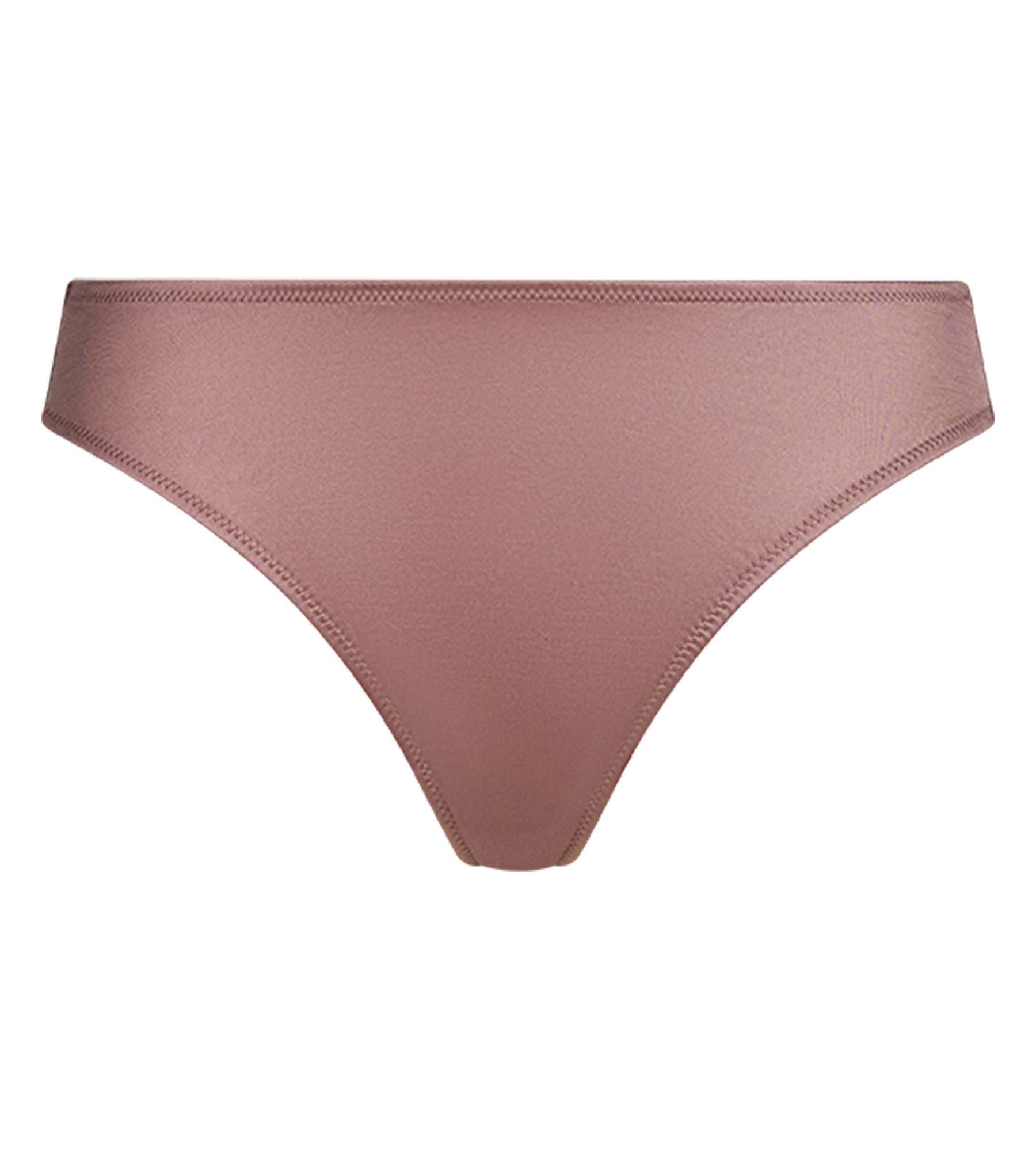 Bajo su aspecto depurado, el tanga brasileño Dim Chocolove de satén y encaje marrón juega con el contraste entre la suavidad y la transparencia refinada.