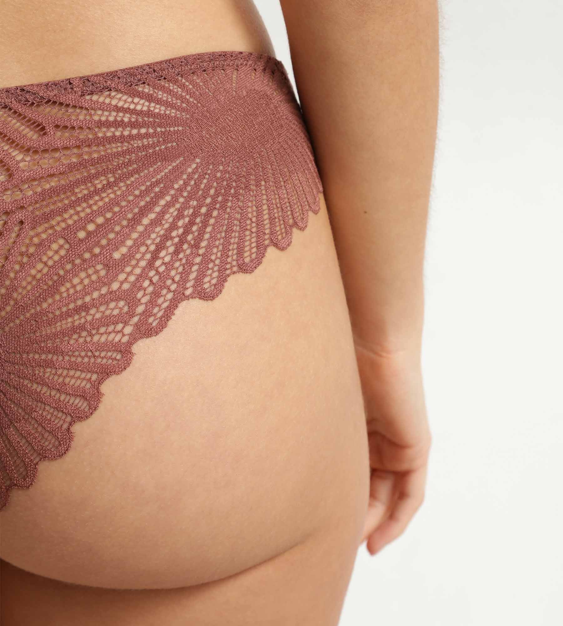 Estas braguitas combinan una parte delantera de satén liso con una parte trasera de encaje floral con motivos gráficos. El corte brasileño deja ver sutilmente la curva de los glúteos sin renunciar a la comodidad. Los acabados sin costuras refuerzan la ligereza del modelo, mientras que el color Nutmeg le da un toque moderno. Una prenda para el día a día, cuidada hasta el último detalle.
