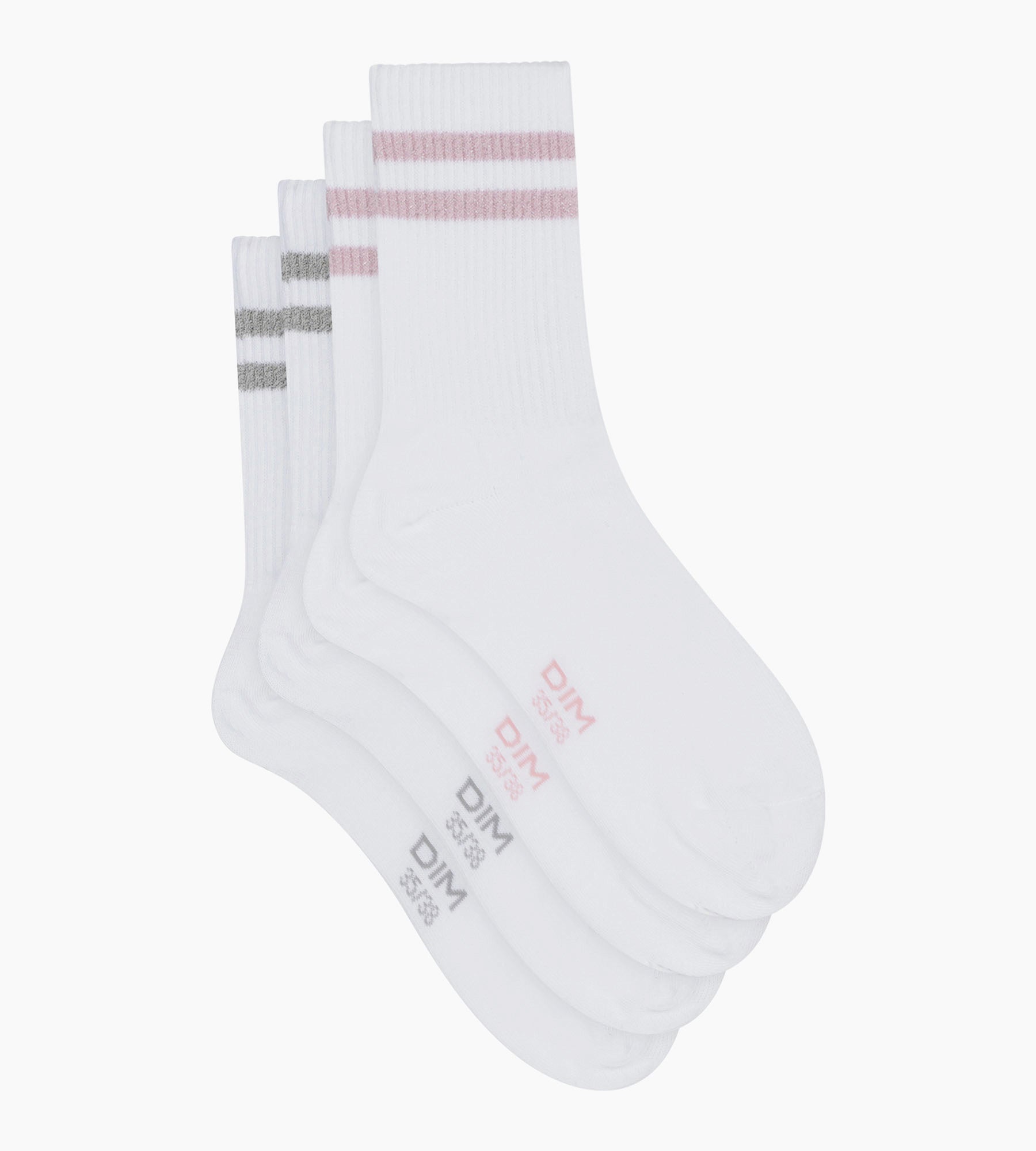 Entre el estilo deportivo y el toque brillante, el pack de 2 pares de calcetines de mujer de algodón blanco y lurex rosa/plata Dim Mode revisita el estilo casual con elegancia.