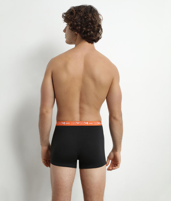 Adoptez le look sobrement dynamique du lot de 2 boxers homme Noirs Dim Coton Stretch aux ceintures colorées Bleu et Orange.