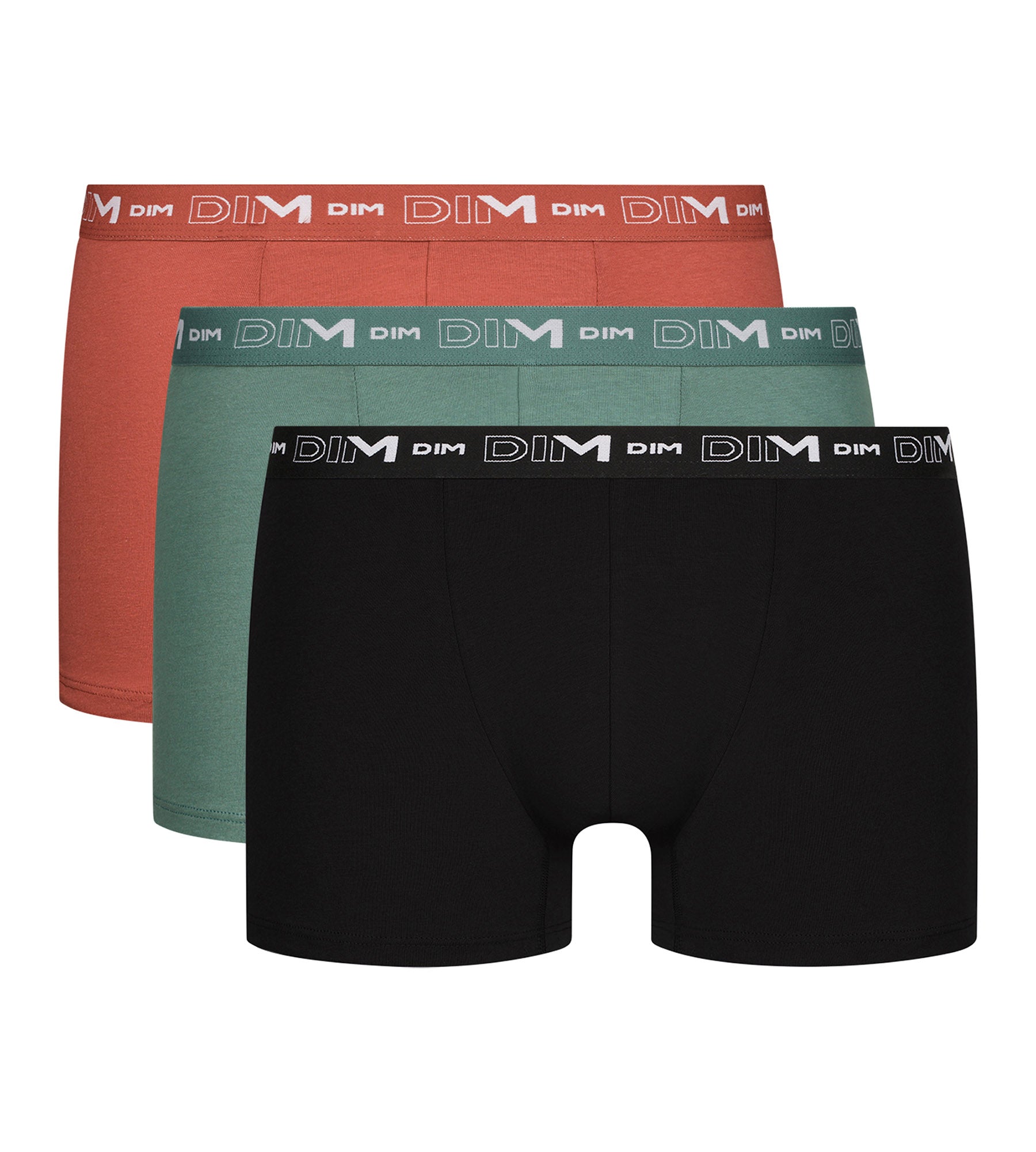 Succombez au lot de 3 boxers pour homme Dim Coton Stretch en noir, vert et terre cuite, ultra contemporain !