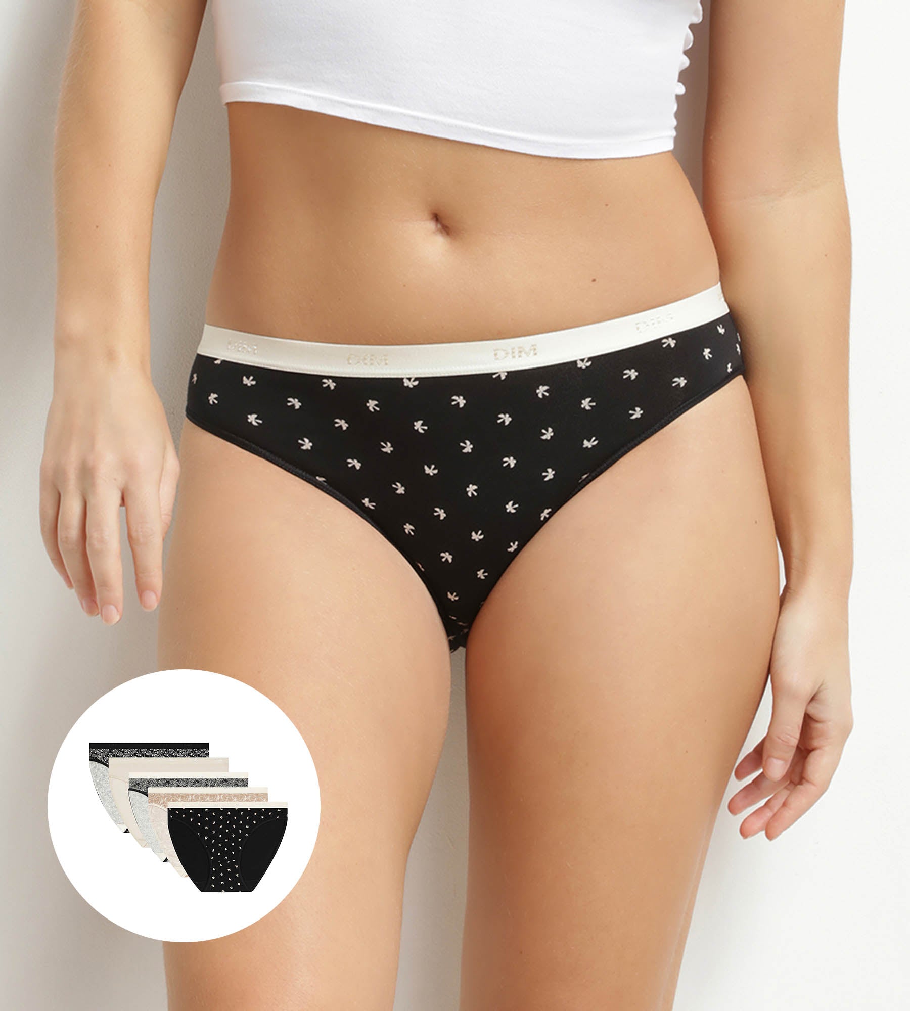 Mode évasion activé avec le lot de 5 culottes femme Les Pockets de Dim en coton stretch, aux motifs exotiques sobres.