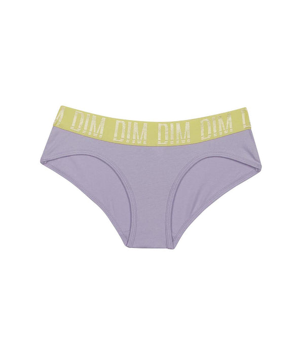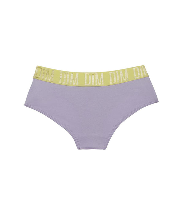 On craque pour le look à la fois efficace et coquet de ce shorty enfant Dim Sport, en coton stretch Lila à coutures douces, et à la bande de maintien Vert Anis avec signature Dim argentée, vive et captivante !