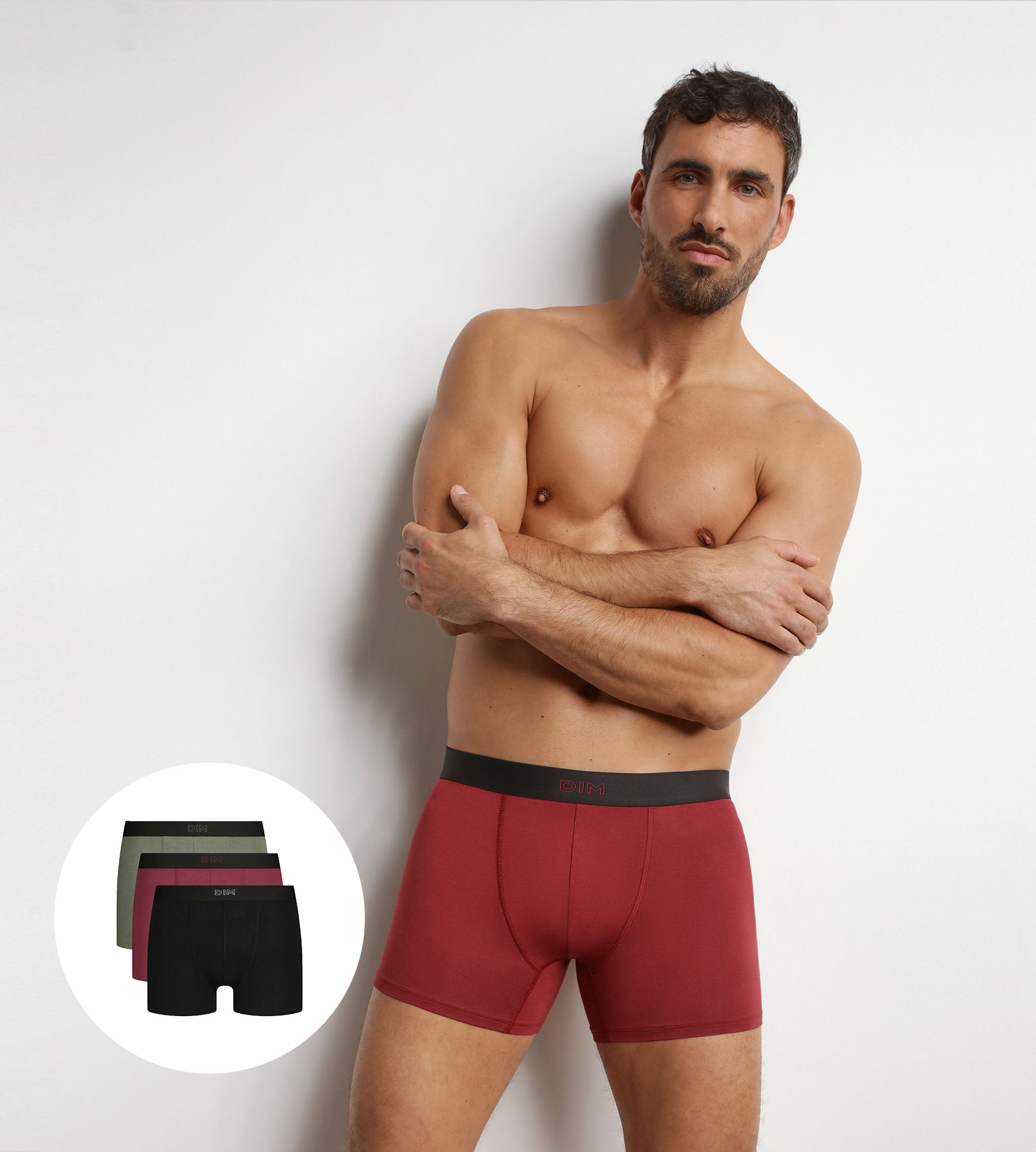 Renforcez votre confort quotidien avec le lot de 3 boxers homme Dim Pur Confort en Noir, Kaki et Rouge, des essentiels qui allient maintien et style.