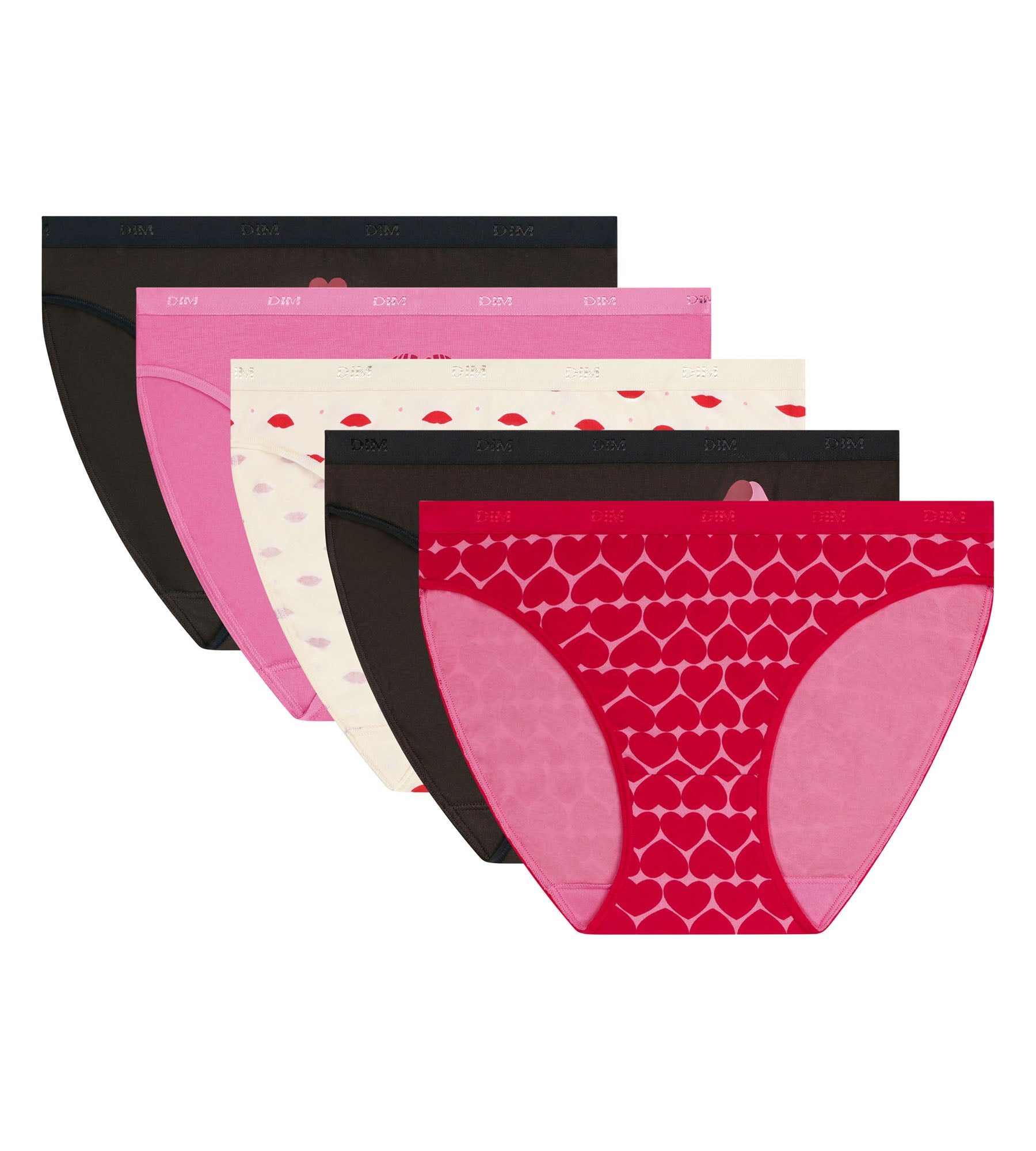 Apportez une note d’espièglerie à votre lingerie avec le lot de 5 culottes femme Les Pockets de Dim en cotonstretch et motifs cœurs.