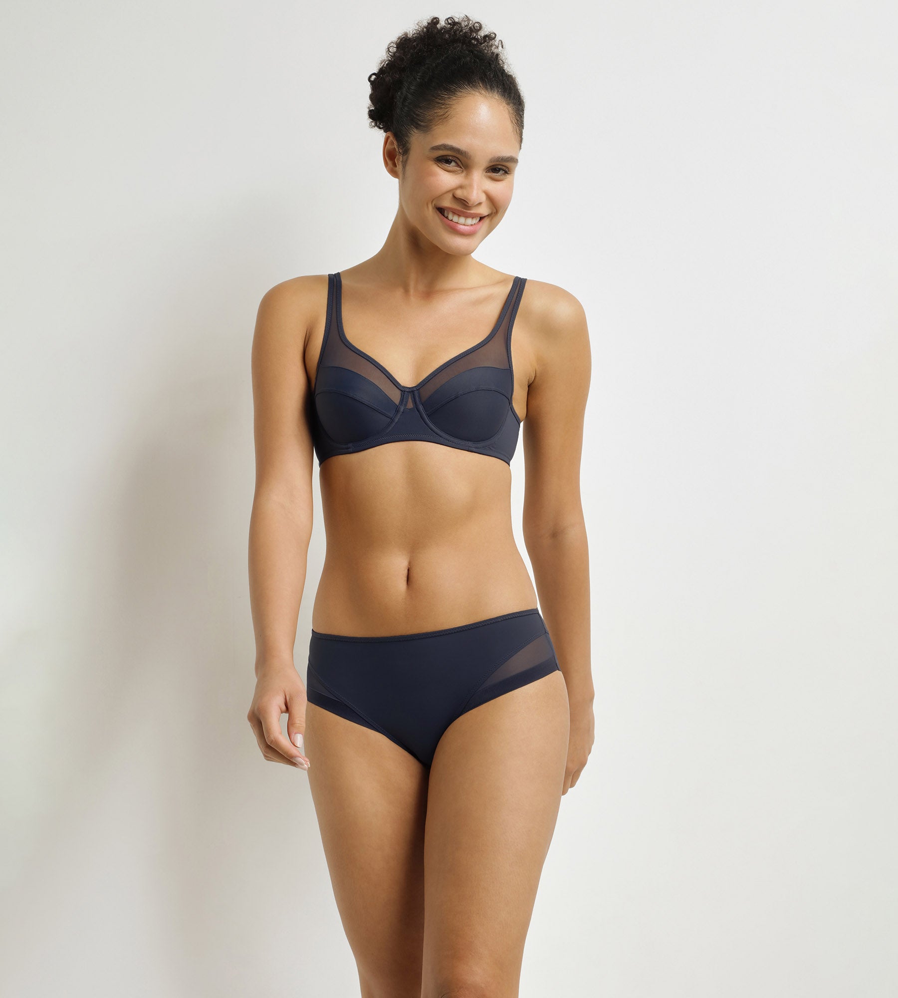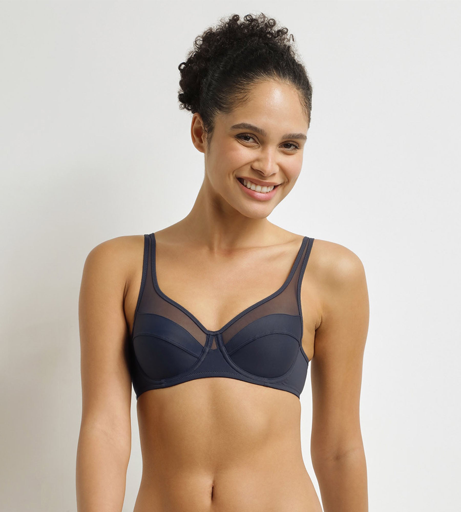Combineer steun, moderniteit en luchtigheid met de Royale geborduurde bh van microvezel en blauwe tule.
