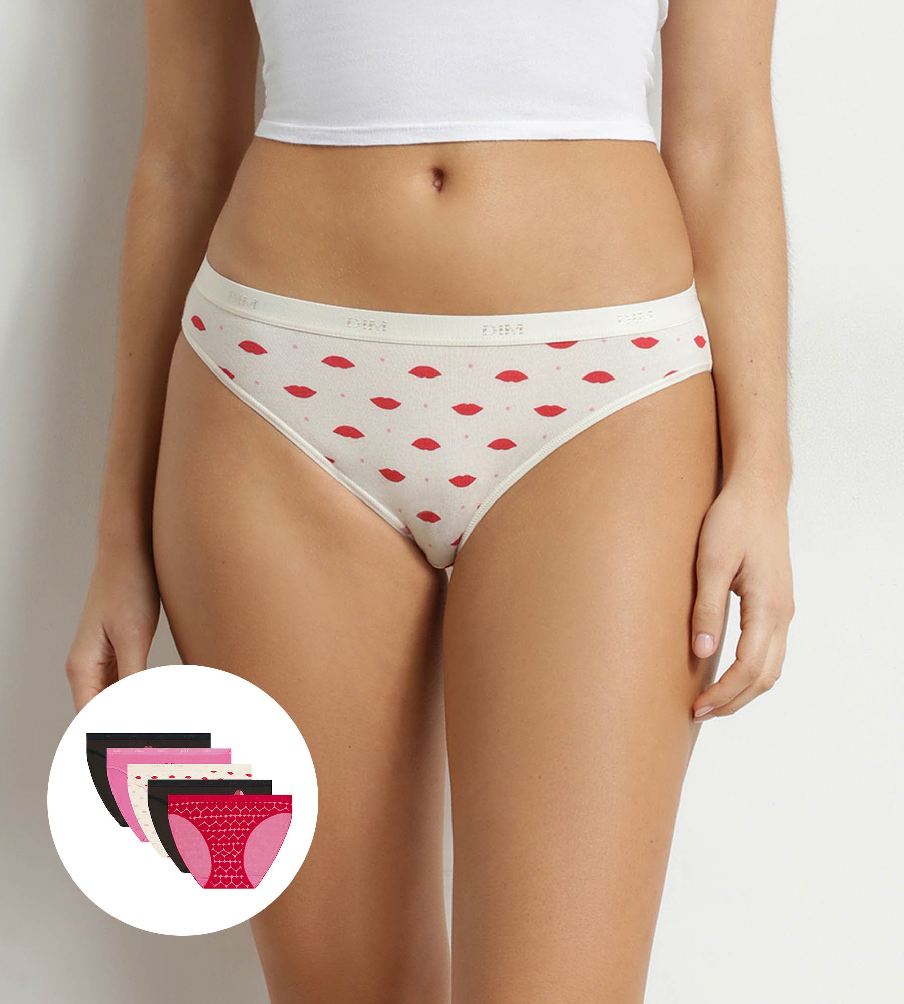 Voeg een vleugje speelsheid toe aan je lingerie met de Les Pockets set van 5 damesslips van Dim in stretchkatoen met hartmotieven.