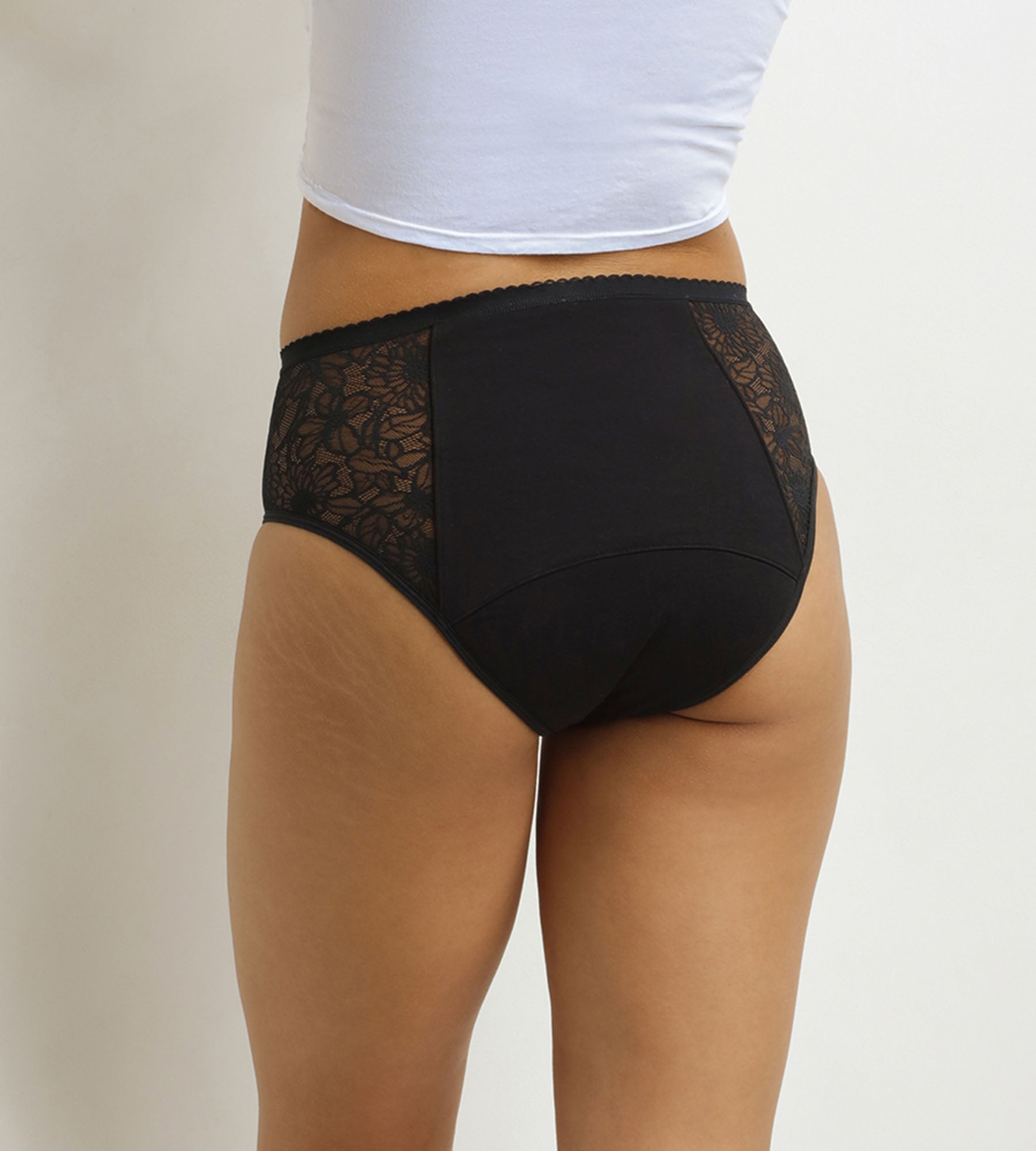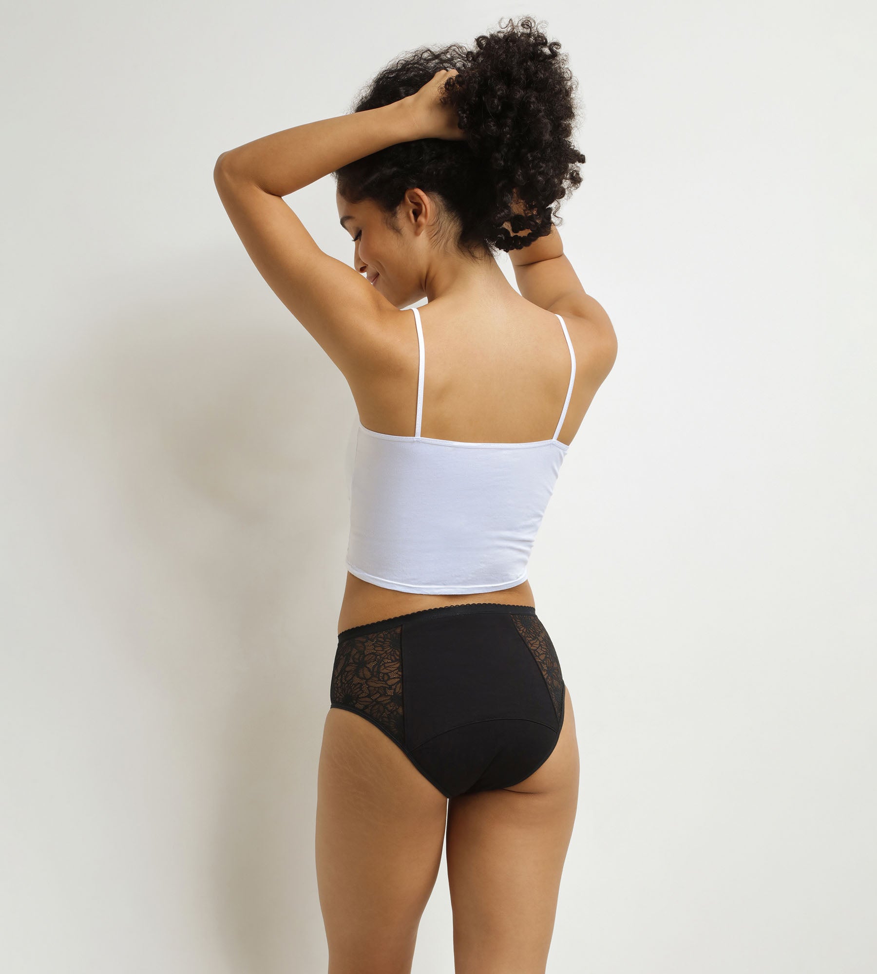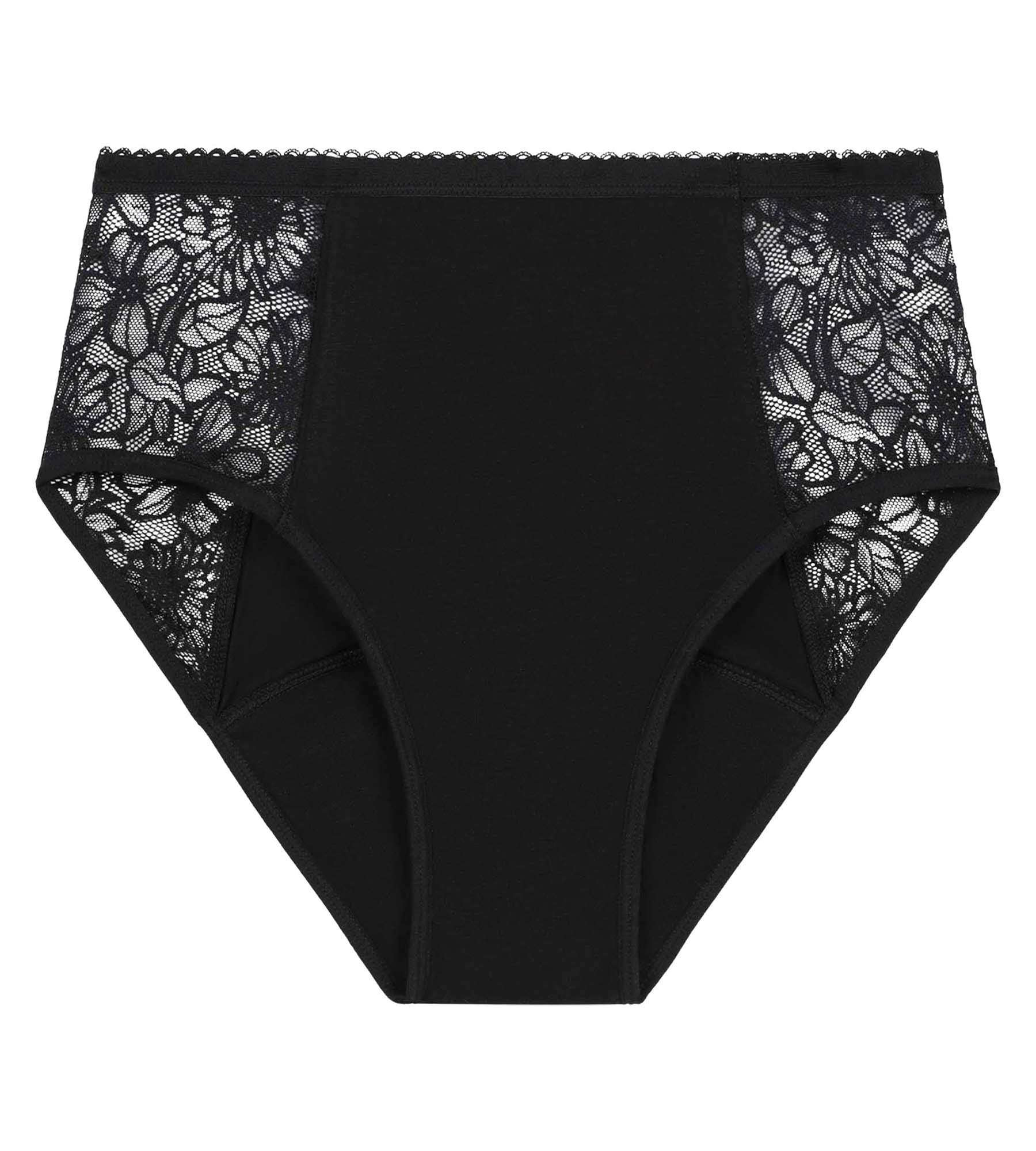 Kies voor de Dim Protect menstruatieslips van biologisch katoen en zwart bloemenkant: betrouwbare, vrouwelijke bescherming voor zeer zware menstruaties.