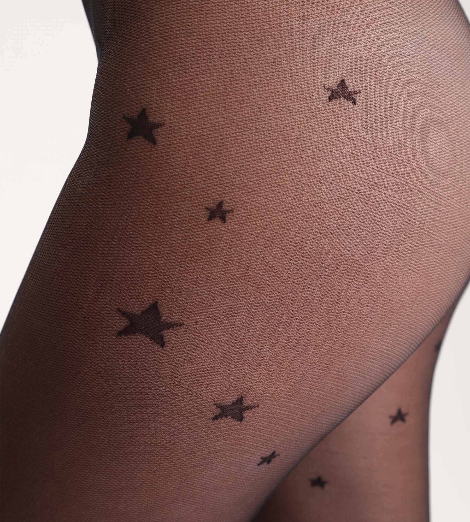 Liefde aan de kosmische stijl van de fancy panty van DIM Style, in zwarte transparante voile versierd met sterrenmotieven.