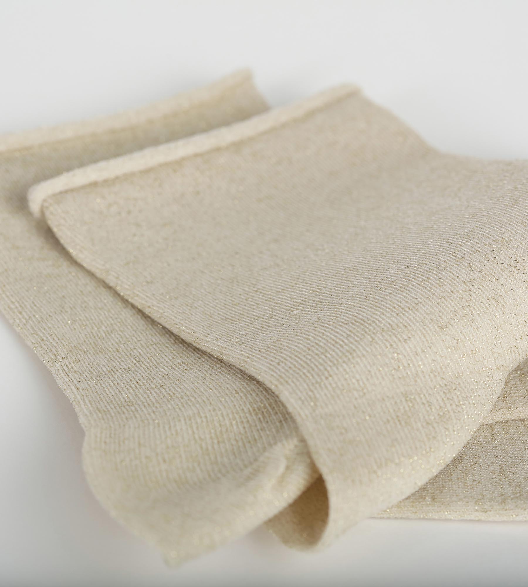 La chaussette femme Dim Mode en lurex Beige mise sur une matière douce légèrement irisée pour revisiter un essentiel du vestiaire.