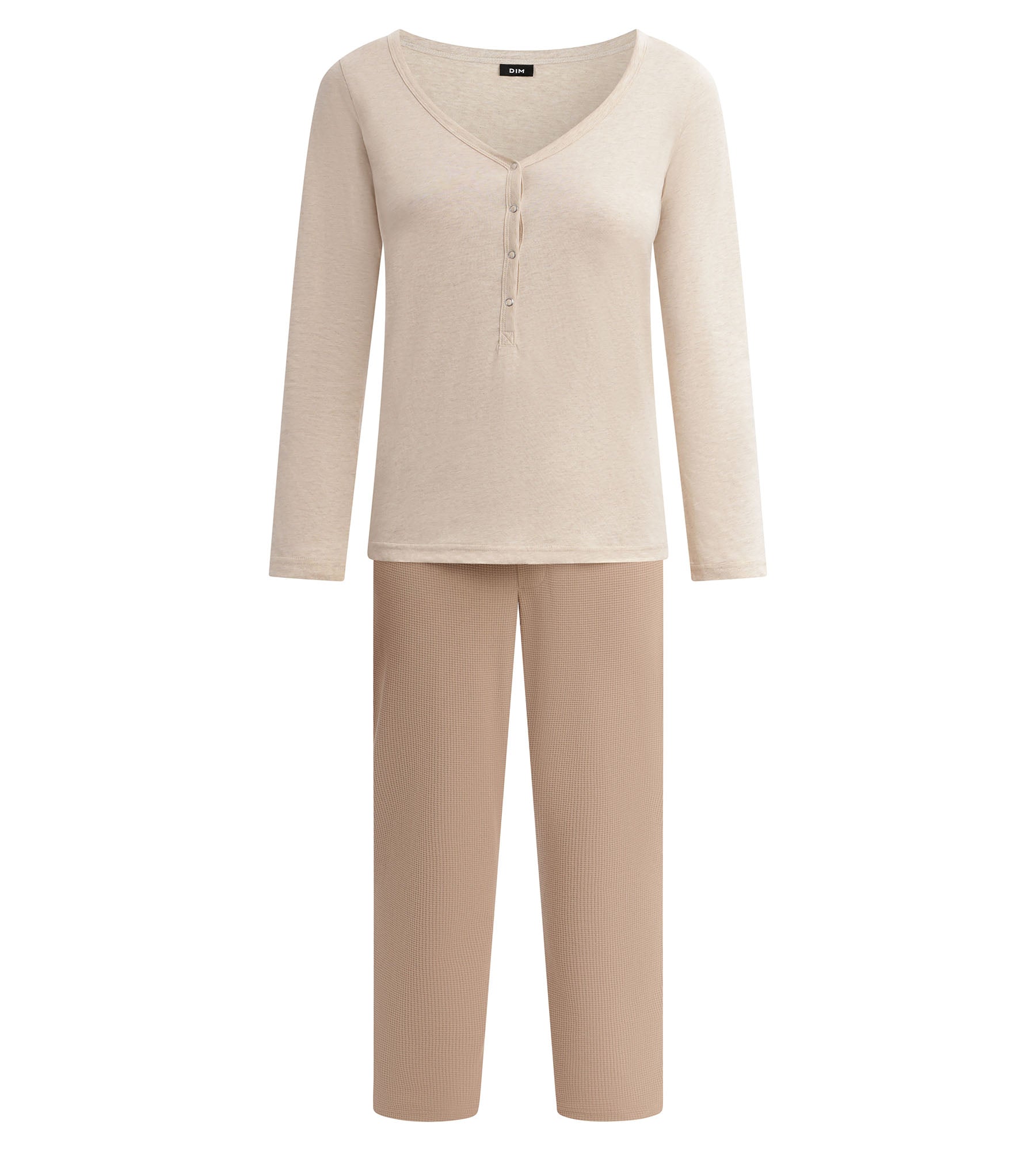 Craquez pour la douceur et l’élégance naturelle de l’ensemble pyjama femme Dim Cosy Time en jersey bicolore Beige et Marron Taupe !
