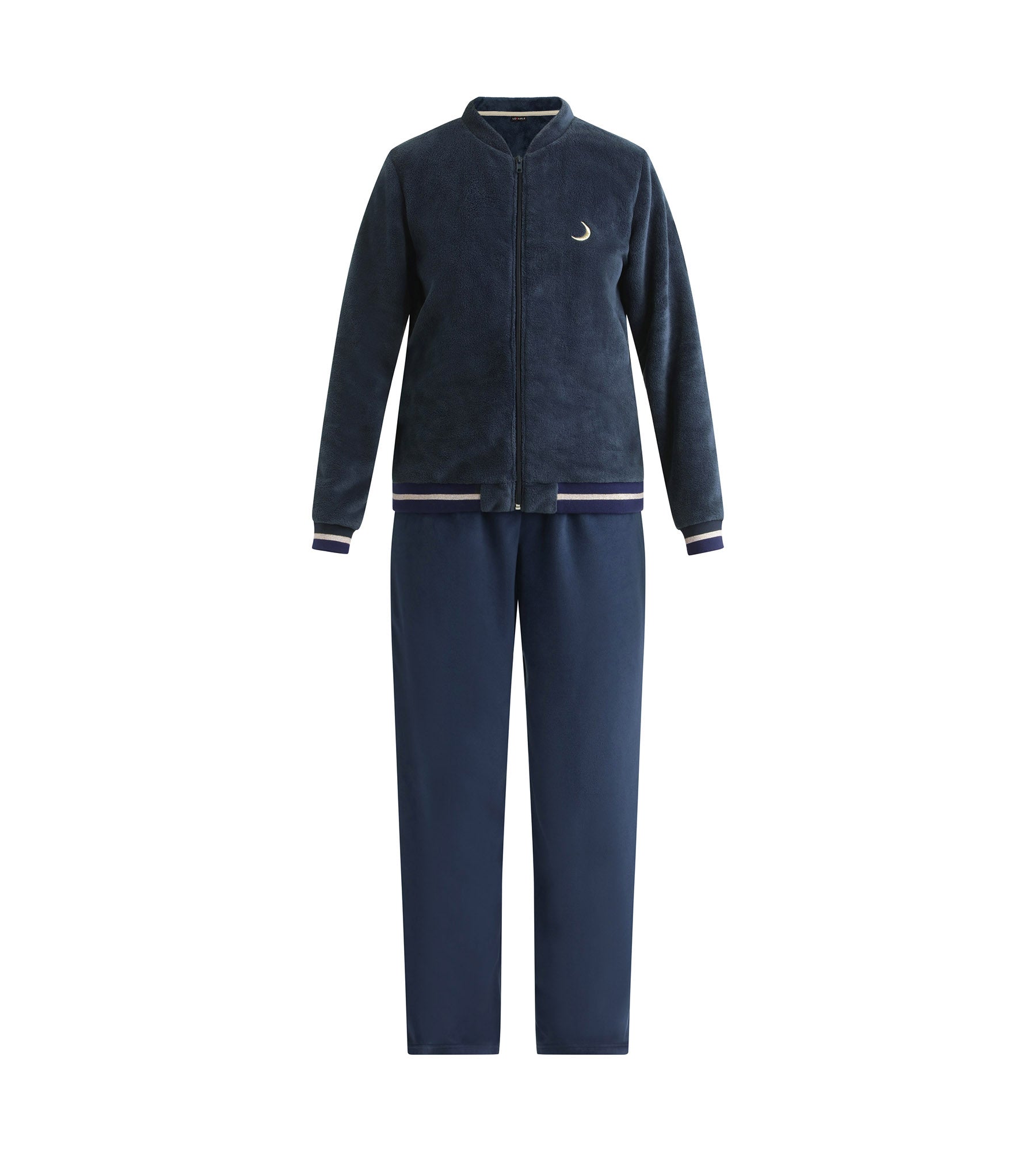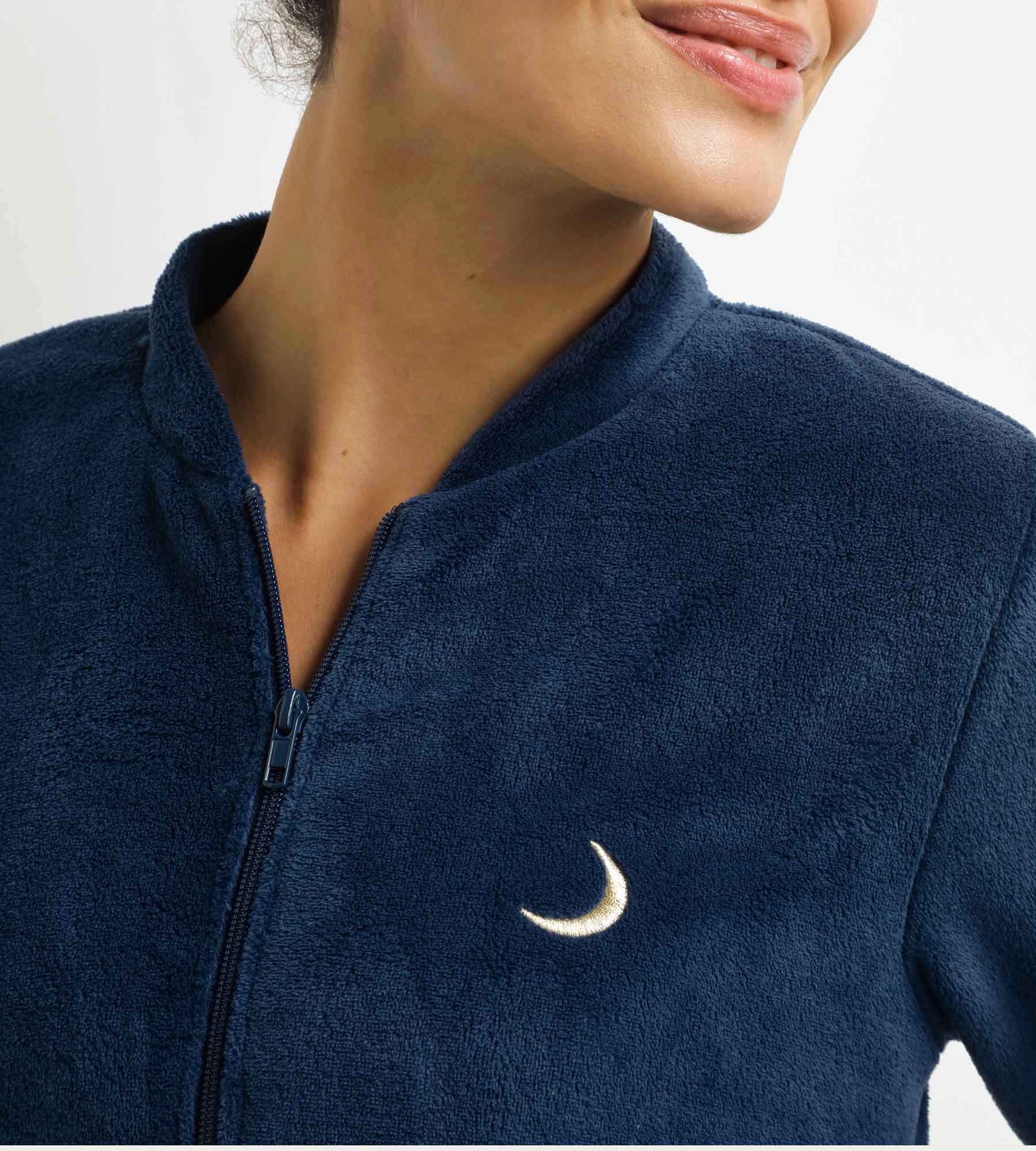 Douillet et pratique, cet ensemble pyjama Dim en velours vous garde bien au chaud. Le haut avec fermeture éclair affiche un col rond, une coupe confortable et un petit motif lune brodé côté cœur. Le pantalon fluide se règle facilement grâce à son lien à la taille. Des touches dorées au col, aux poignets et à la ceinture ajoutent une note chic à ce set Bleu Minuit. Un pyjama femme idéal pour se détendre avec style.