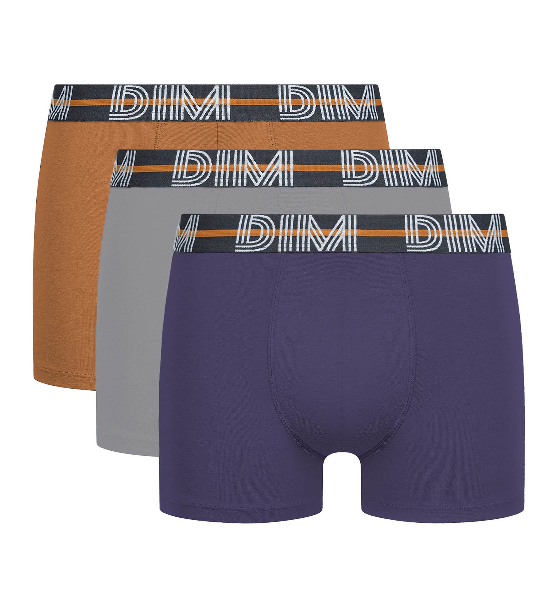 Misez sur le lot de 3 boxers homme Dim Powerful en coton stretch Violet, Gris et Terre Brûlée, pour un look à la fois confortable et moderne !