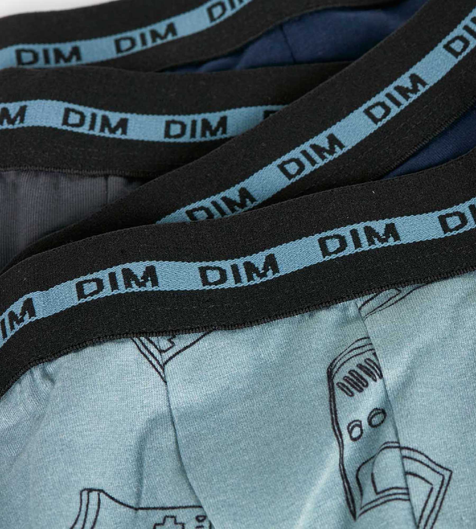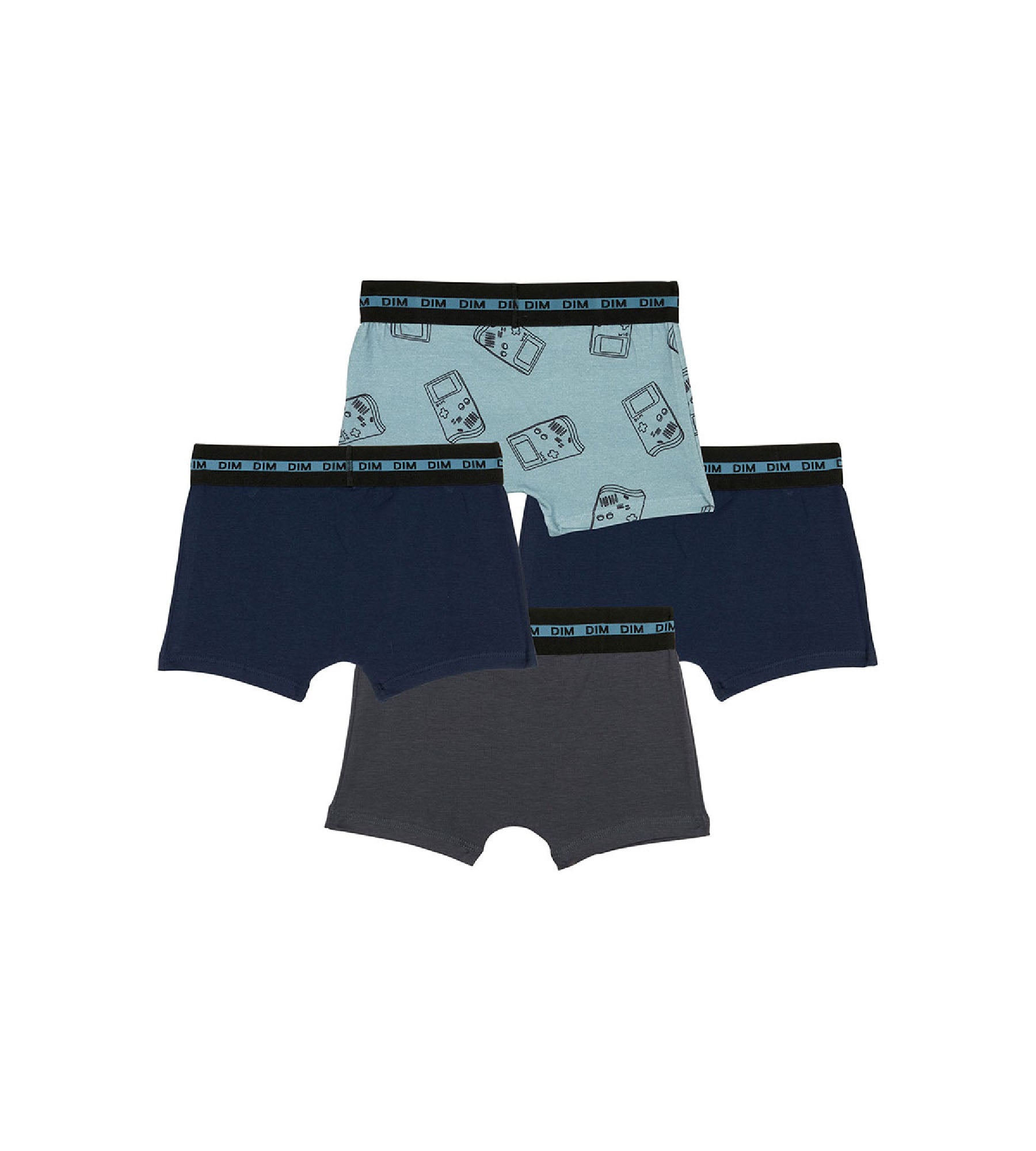 Composé de 3 Sous-Vêtements pour Garçon en coton stretch uni Bleu Nuit et Gris Foncé, et d’un boxer enfant Bleu Tendre illustré de gameboys, le lot de 4 Sous-vêtements Enfant EcoDim Mode est son basique passe-partout à la fois soigné et fun !