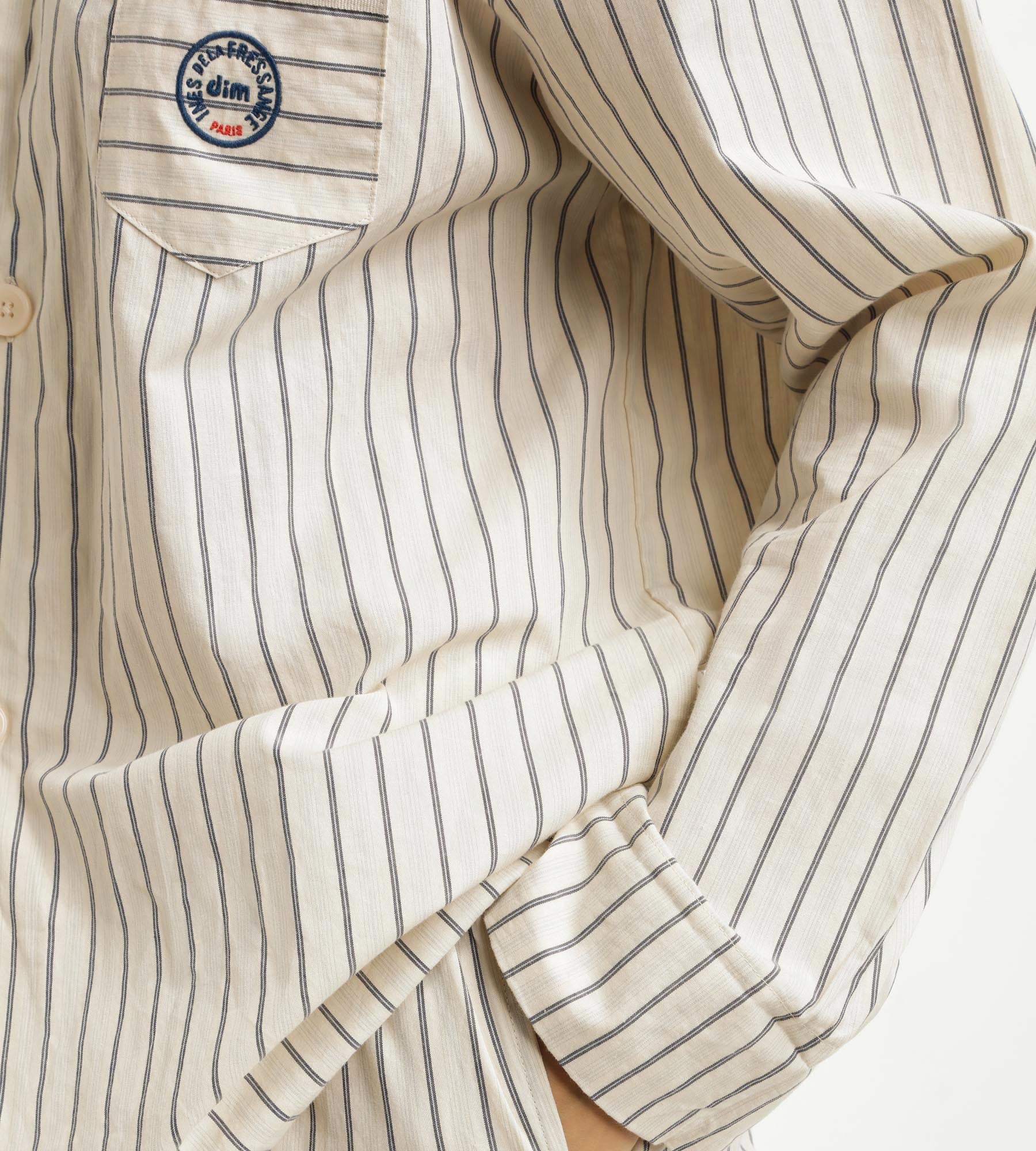 Cet ensemble pyjama femme Dim x Ines de La Fressange combine confort et style avec sa matière fluide et ses rayures élégantes. La chemise légère à col classique offre une allure raffinée, rehaussée par une poche poitrine brodée. Le pantalon droit, avec sa ceinture élastique, assure une tenue agréable sans serrer. Les rayures verticales bleu clair et bleu foncé sur fond beige allongent visuellement la silhouette, tout en apportant une touche de fraîcheur. Un modèle chic et intemporel pour des nuits paisibles.