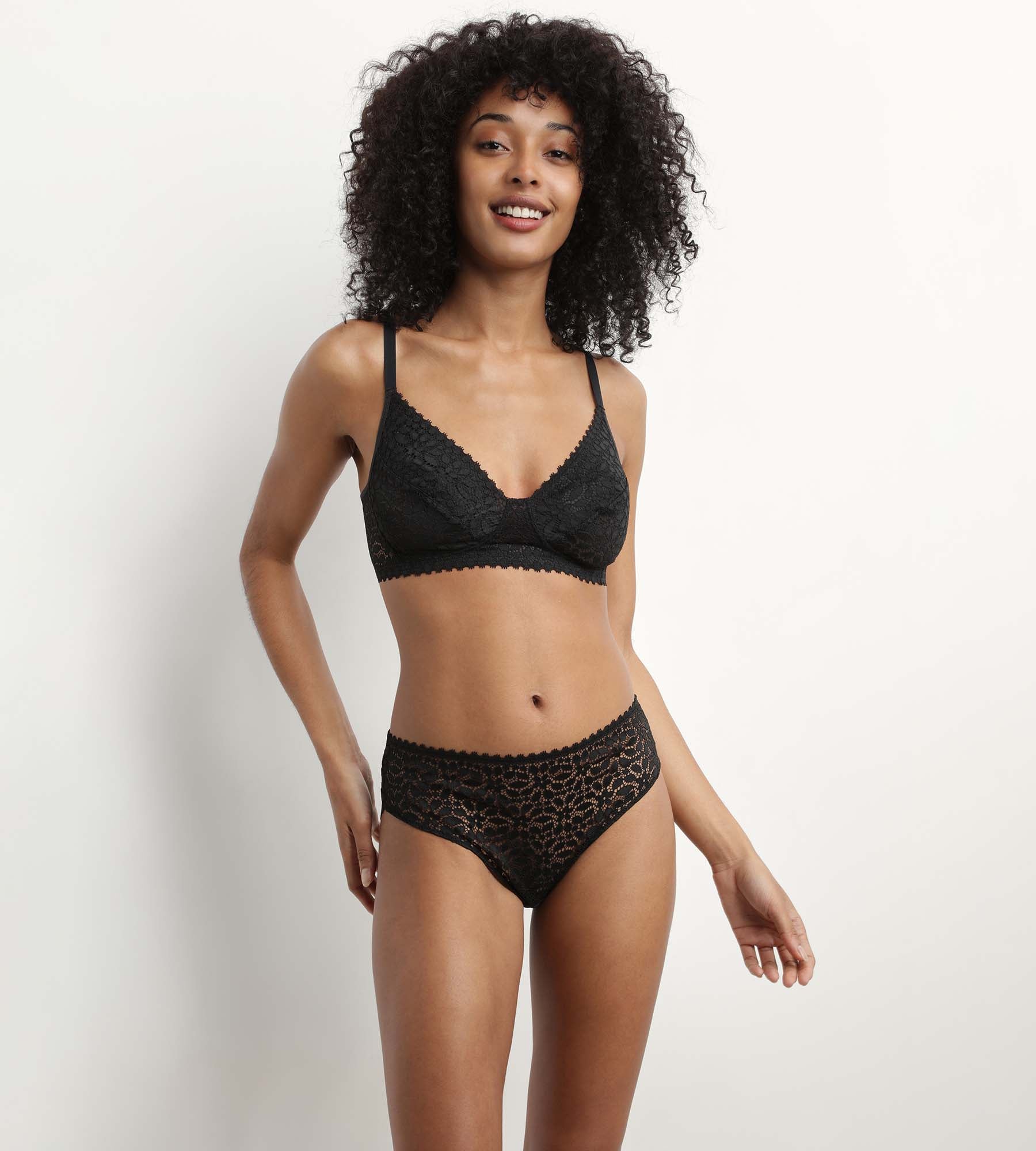Sublimez naturellement votre poitrine avec le soutien-gorge triangle Daily Dentelle, construit sans armature et avec des bonnets souples. Vos seins sont galbés, sans contrainte ! Vous allez adorer la dentelle noire à fleurs, et le décolleté en V de cette lingerie noire, très raffinée !