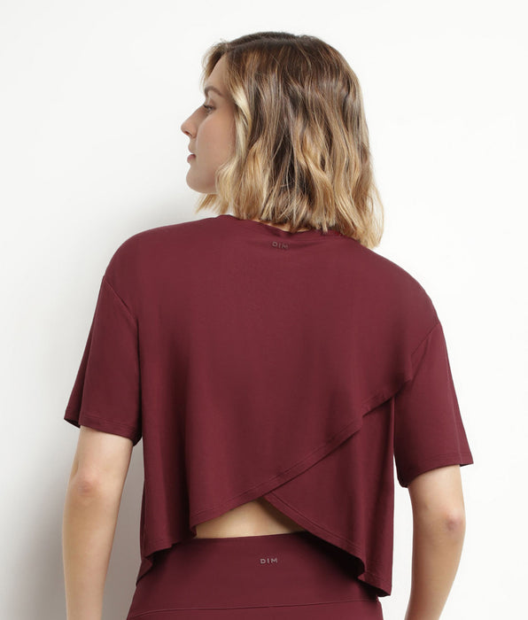 Succombez pour le look casual du t-shirt de sport femme au dos ouvert en viscose Bordeaux Dim Move !